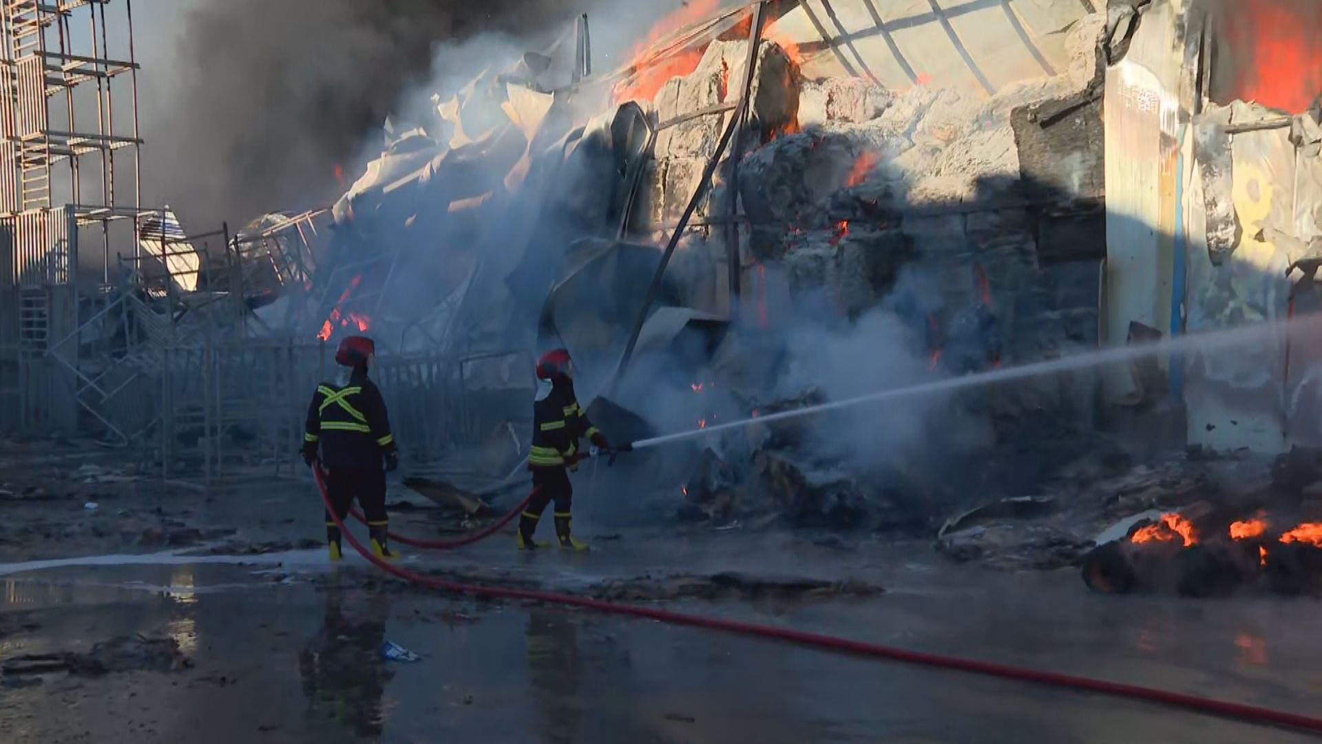 Two firefighters trying to extinguish fire at a potato chip factory in Erbil on Tuesday, January 6, 2026. Photo: Rudaw/screengrab