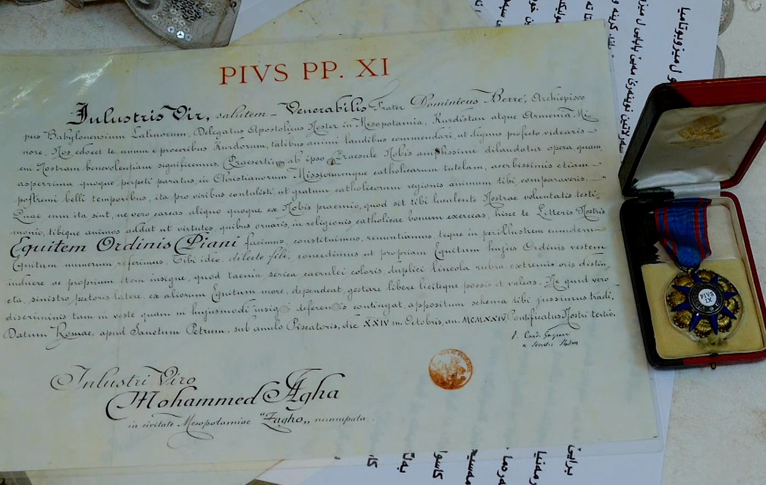"This is the award presented to my grandfather, late Mohammed Shammadin Agha Selvan by Pope Pius XI,” Saad Mohammed Haji Agha told Rudaw on Thursday. “Despite all the hardships, displacement and difficulties our nation saw across different periods of time from 1958 to 1991 and to 2003, and from 2003 up to now, we have kept this award safe and passed it from one generation to the other.”
