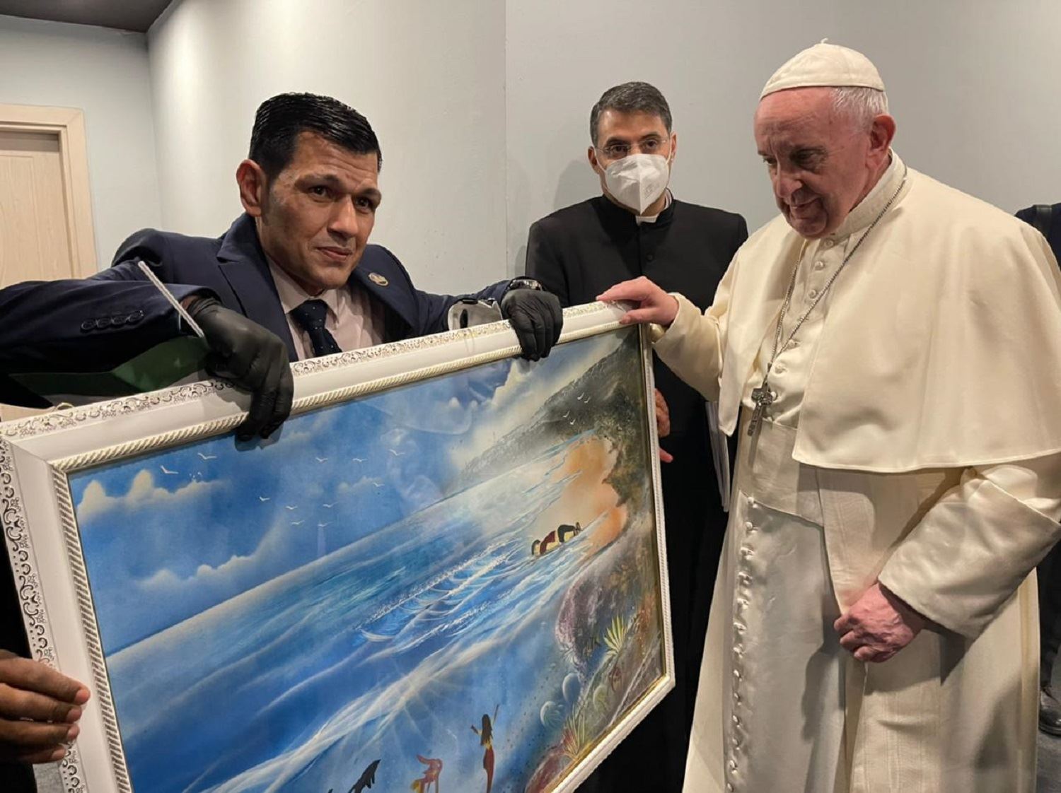 Abdullah Kurdi meets with Pope Francis after the pontiff's mass in Erbil and gives him painting of drowned son on March 7. Photo: Handout to Rudaw