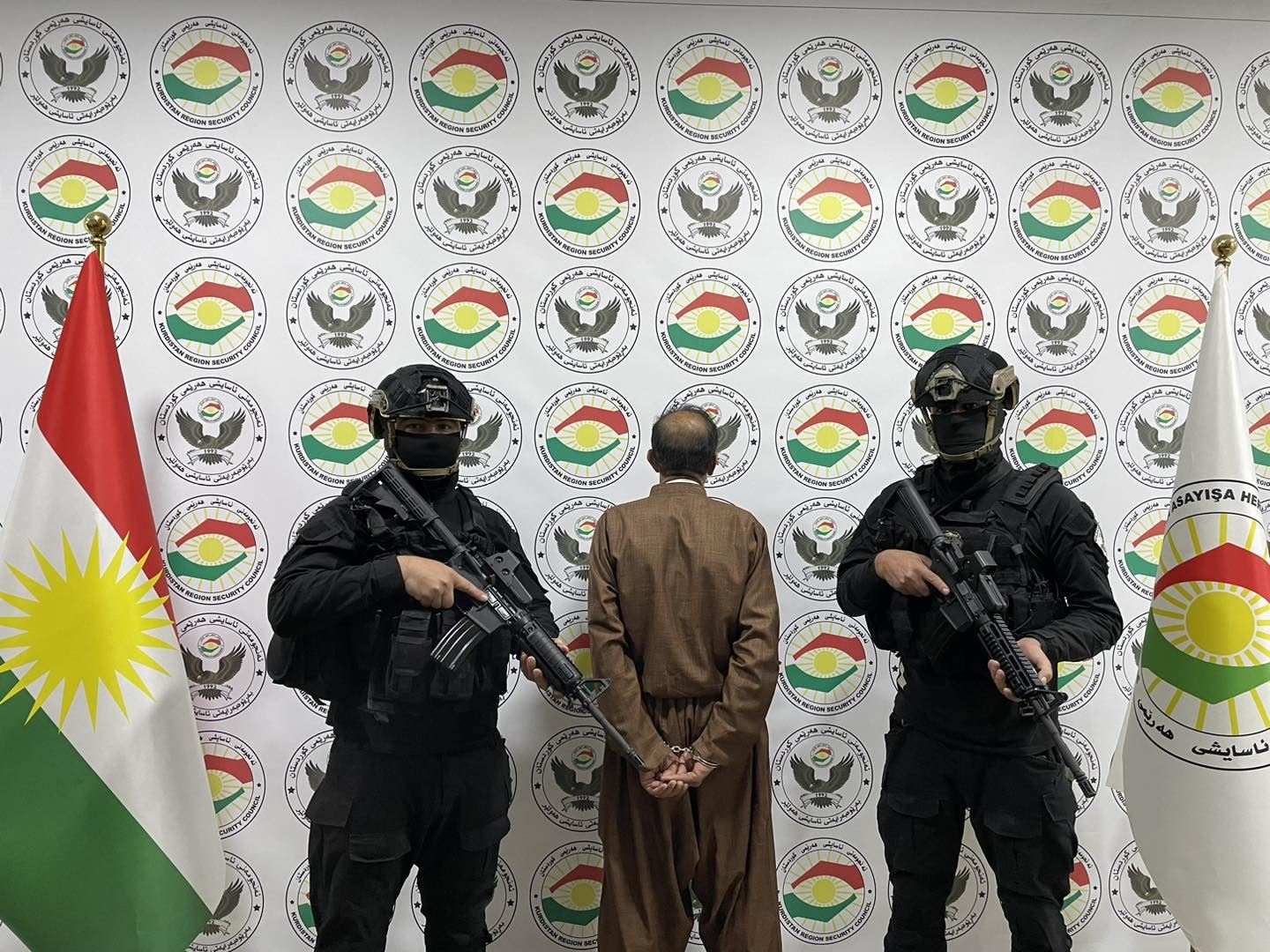 Man (middle) arrested by security forces in relation to the death of three people in Erbil on June 7, 2023. Photo: Asayish