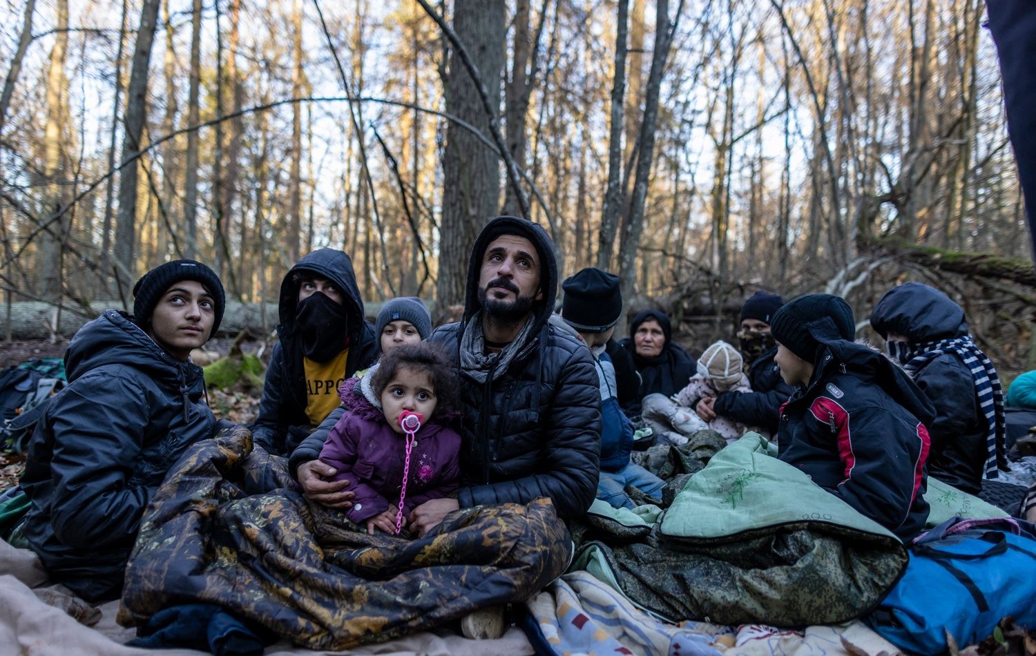 Members of a Kurdish family from Dohuk, Kurdistan Region, in a forest near the Polish-Belarus border on November 9, 2021. Photo: Wojtek Radwanski / AFP