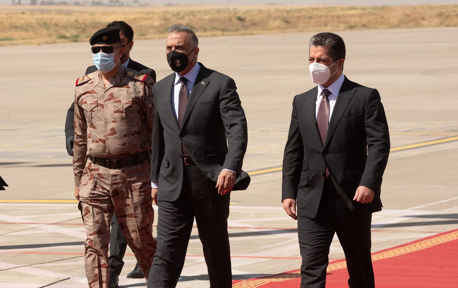 Iraqi Prime Minister Mustafa al-Kadhimi (centre) arrived at Erbil airport on September 10, 2020, where he was greeted by Kurdistan Region Prime Minister Masrour Barzani (right). Photo: Bilind T. Abdullah/Rudaw