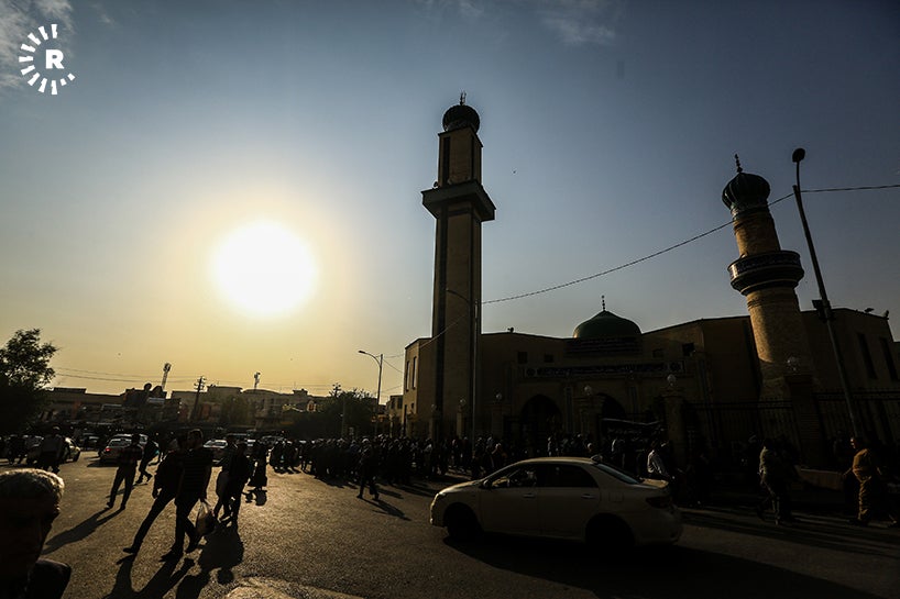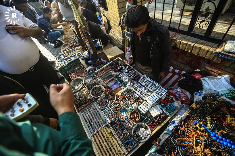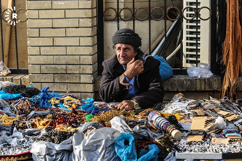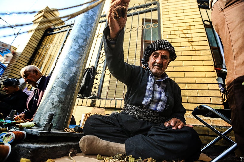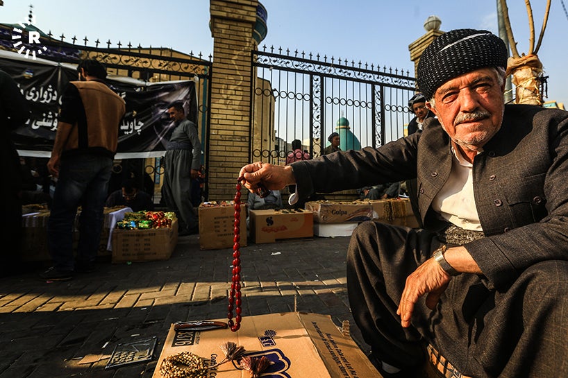 The sidewalks in front of Sulaimani’s Great Mosque are the traditional home to