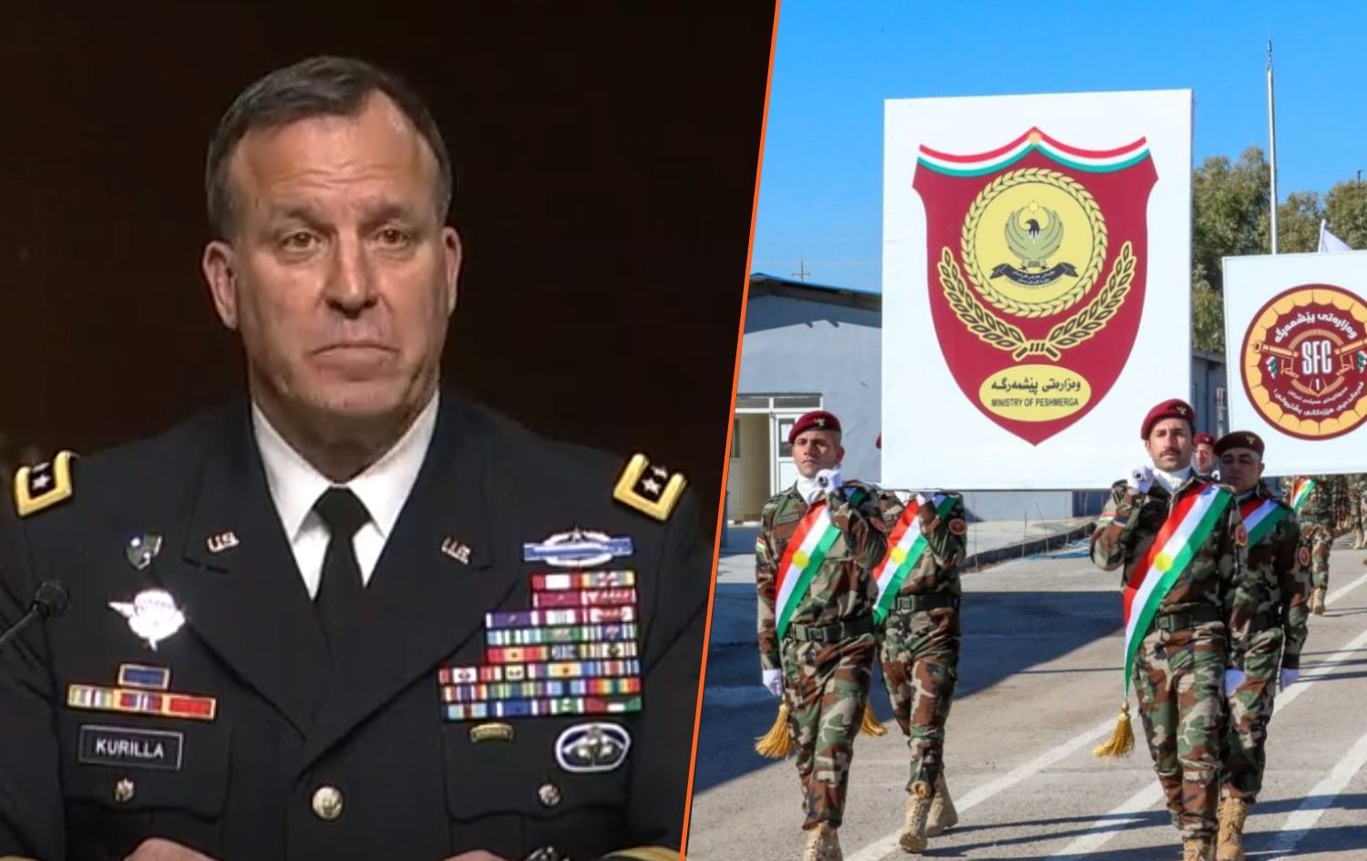Army Lt. Gen. Michael Erik Kurilla (left) speaks at the Senate on February 8, 2022; and file photo of Peshmerga. Photos: handout