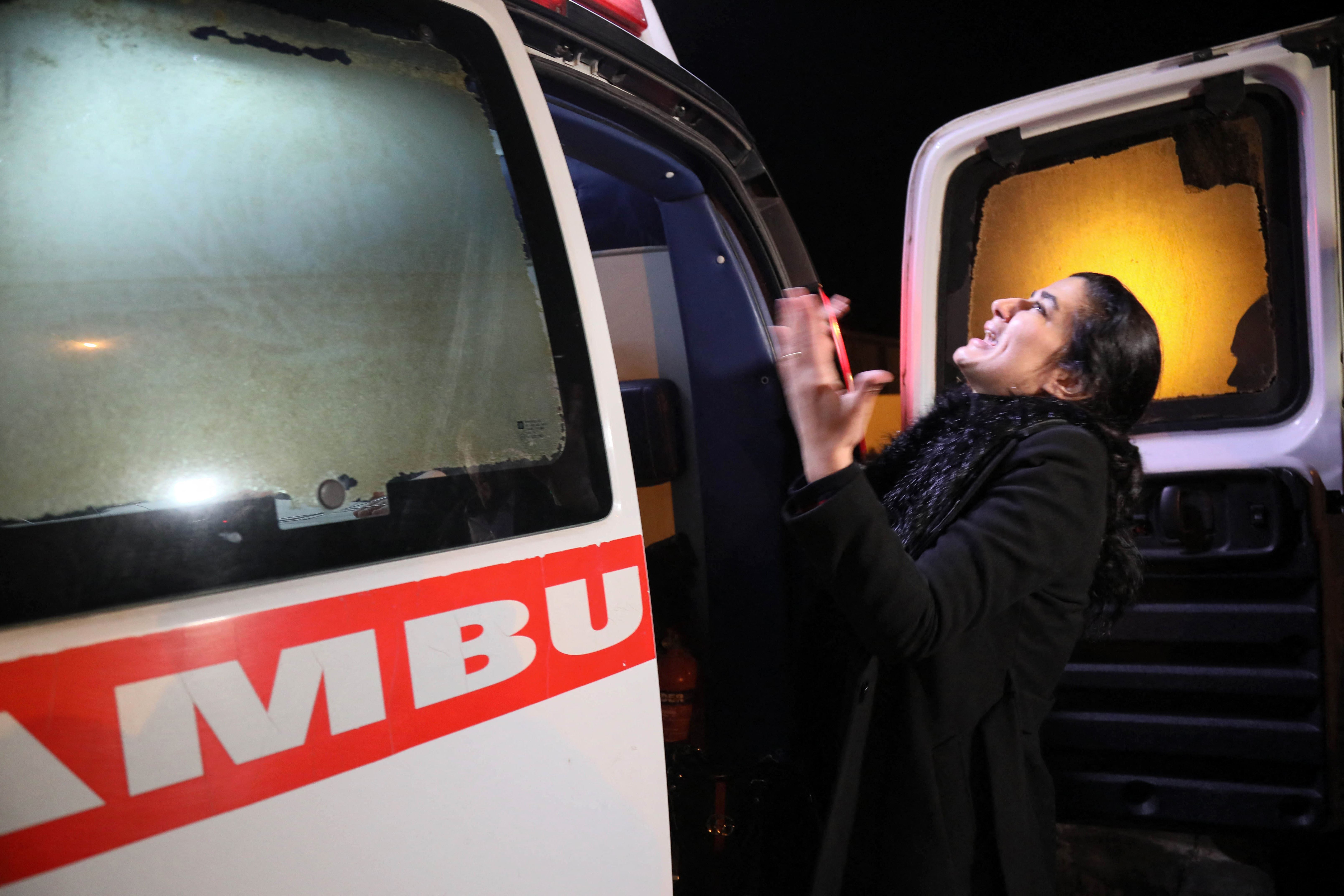 A woman mourns outside an ambulance carrying the remains of five Kurdish migrants at Erbil Airport on February 1, 2022. Photo: Safin Hamed/AFP