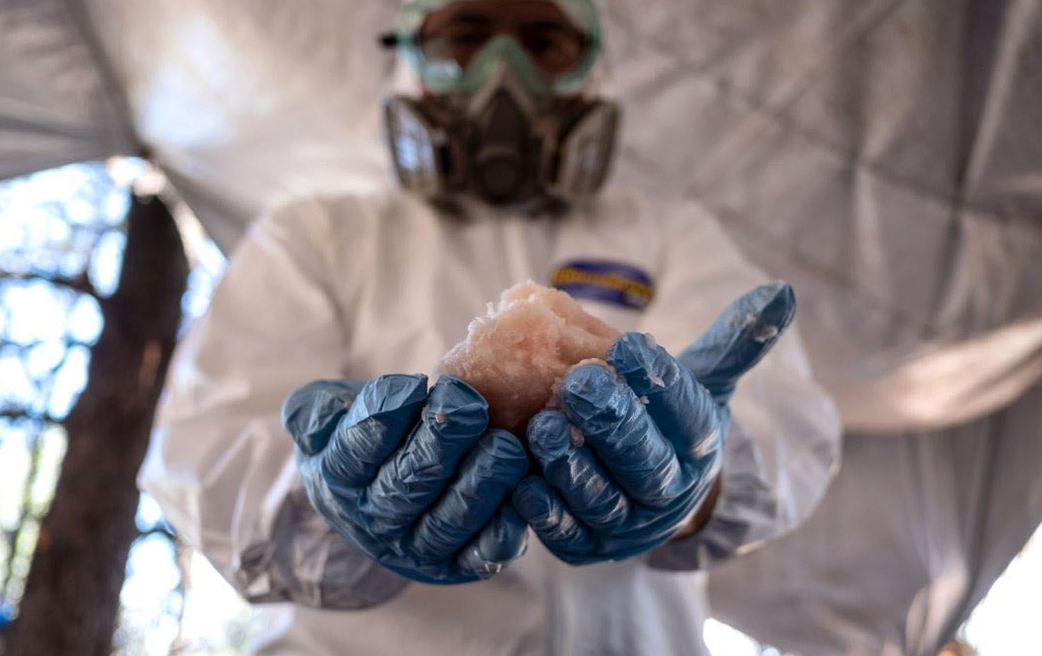 A Mexican Army expert in protective gear displays crystal methamphetamine seized from a clandestine laboratory in northwestern Mexico in August 2018. Photo: Guillermo Arias/AFP