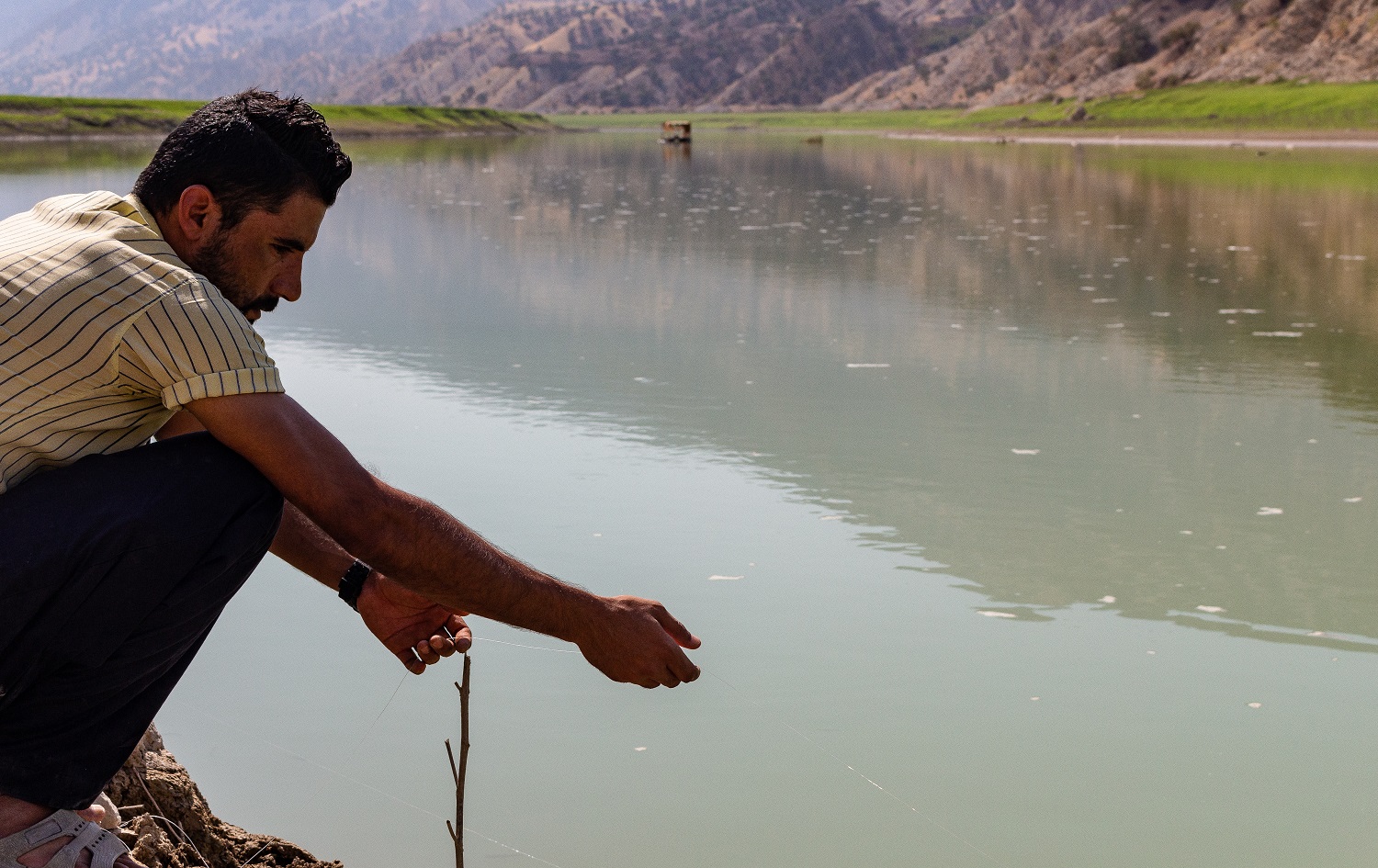 Three fishing lines drift in the calm water of the Sirwan, closely watched by Hunar Mohammed Abdullah, crouched on the river bank. He pulls a line in to check the bait, deciding to replace it with a new piece of bread dough that he molds around the hook. He stands up, whips the hook round and round in the air, and tosses it with a lunge. It whistles before landing in the river with a small splash. Hunar secures the line on a stick jammed into the river bank and turns his attention to a second line. Pulls it in, adjusts the bait, and throws it back into the water. He sits back and watches. The hot sun beats down and a fly buzzes.