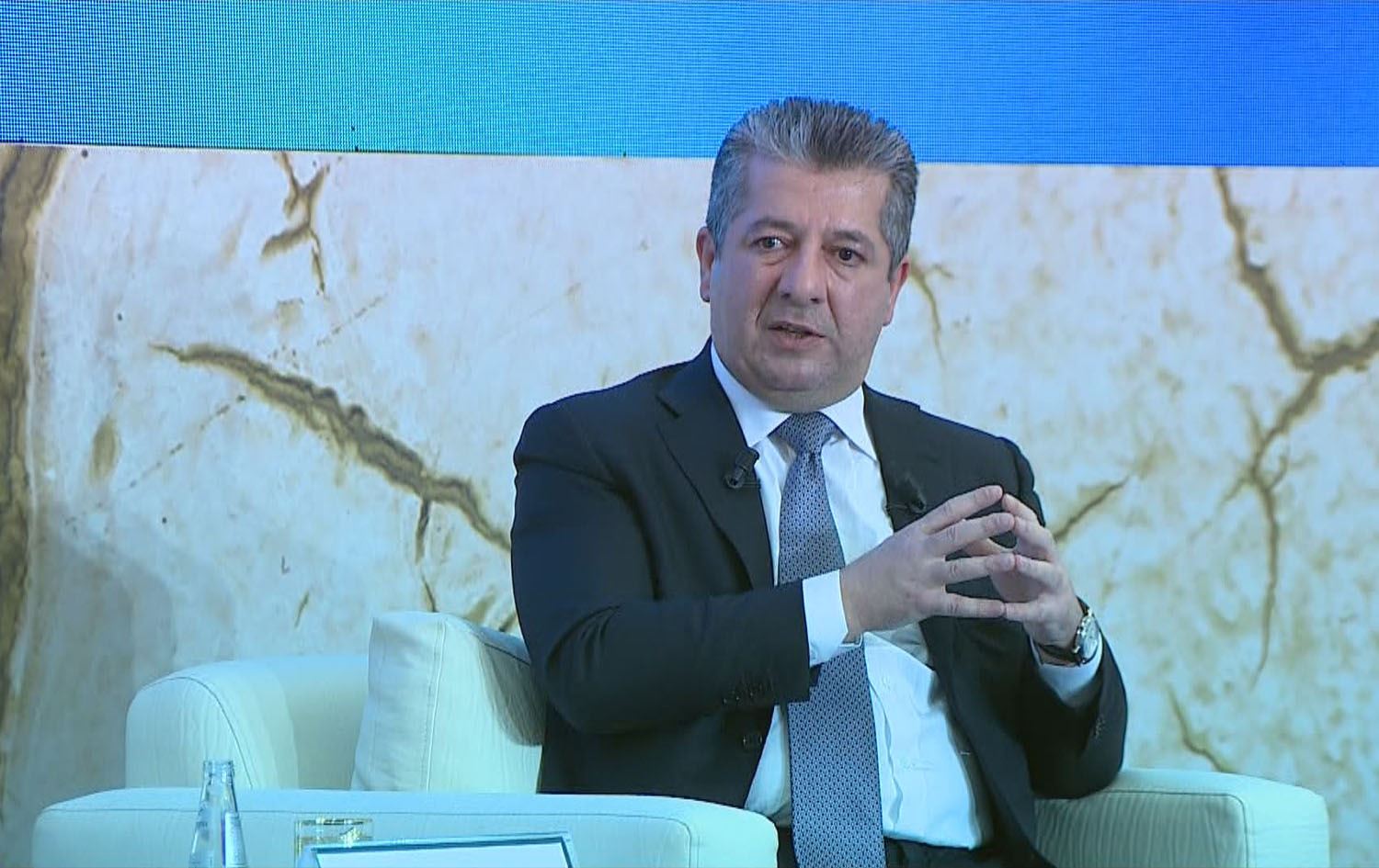 Kurdistan Region Prime Minister Masrour Barzani speaking during a panel at a conference in Erbil titled Drought and the Impact of Climate Change on the Political, Economic, and Demographic Situation of Iraq. Photo: Screengrab/Rudaw