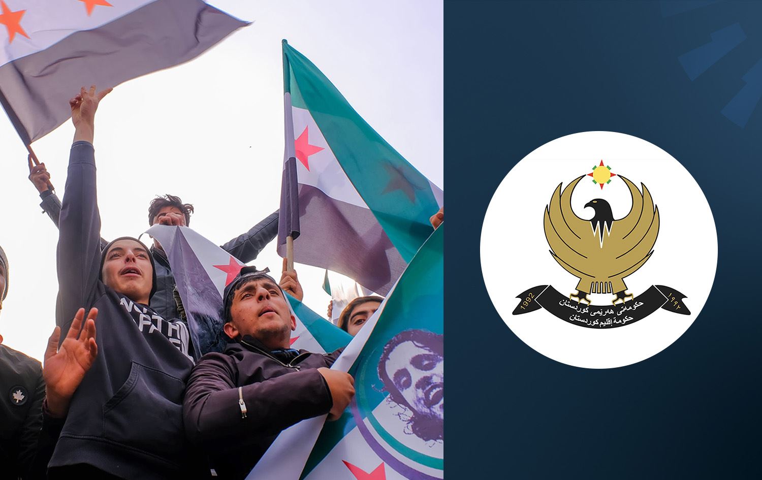 Syrians celebrating the fall of dictator Bashar al-Assad in Erbil in December 2024 (left) and KRG emblem (right). Graphic: Rudaw