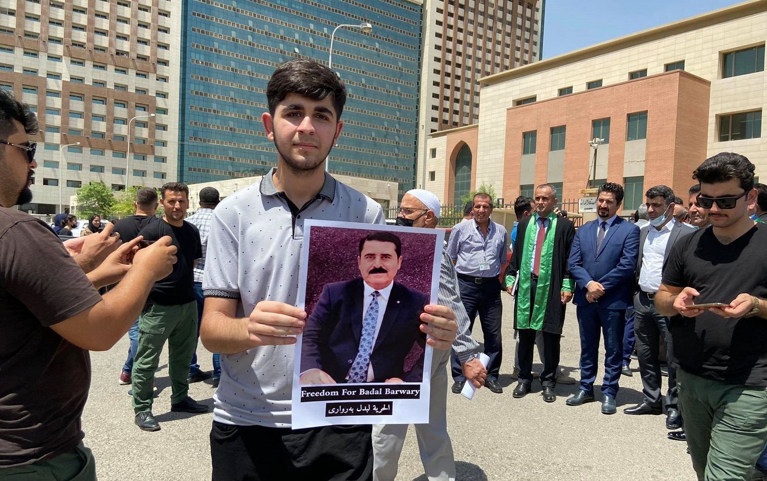 A nephew of Badal Barwari holds up a photo of his jailed uncle outside an Erbil court on July 29, 2021. File photo: Dilan Sirwan/Rudaw