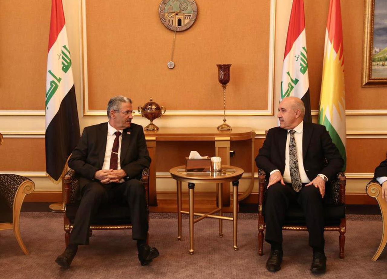 KRG Natural Resources Minister Kamal Muhammad Salih received Iraqi Oil Minister Hayyan Abdul Ghani and his accompanying delegation from the oil ministry, including Undersecretary for Extraction Affairs Basim Mohammed Khudair, and Undersecretary for Distribution Affairs Ali Maarij al-Bahadli, in the Kurdish capital of Erbil.