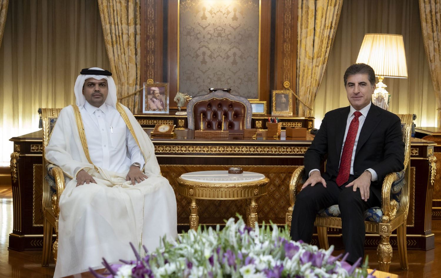 Kurdistan Region President Nechirvan Barzani (right) and Qatar Consul General Hussein Ali Saleh al-Fazala on November 12, 2023. Photo: Office of President Barzani