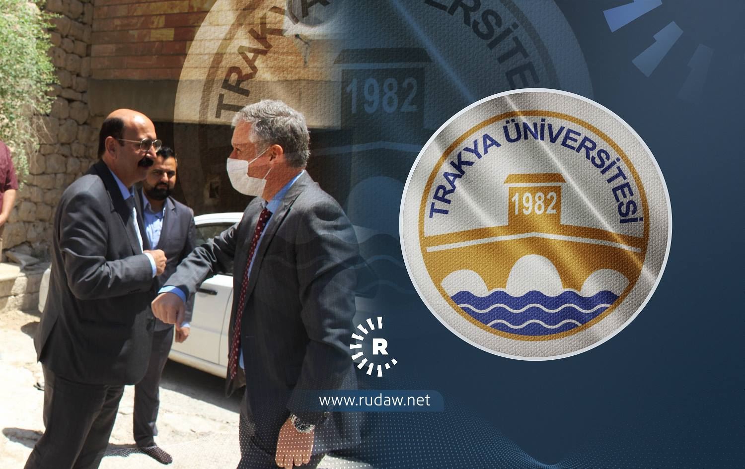 From left: Mir Hazim and Turkish consul general met at Lalish on July 13, 2021., and the logo of Trakya University. Photo: Mir Hazim's office. Graphic: Rudaw