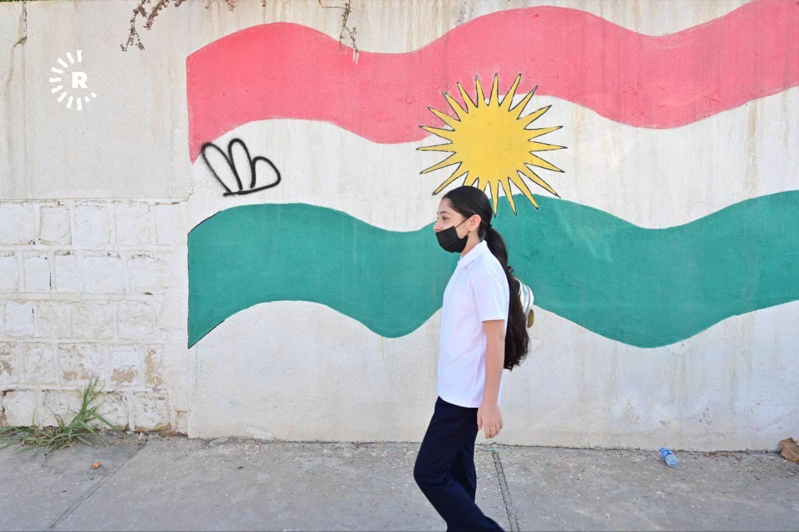 A student passing by a wall with the Kurdish flag painted on it in Erbil on September 13, 2022. Photo: Bilind T. Abdullah/Rudaw