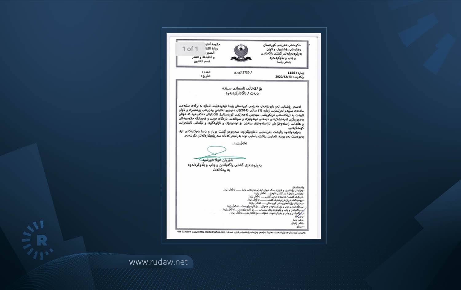 The government claims NRT disregarded a previous directive and has continued to "incite" the public to violent acts, according to an administrative order from Shirwan Aula, the acting director of the Ministry of Culture and Youth’s Broadcasting and Publishing directorate.