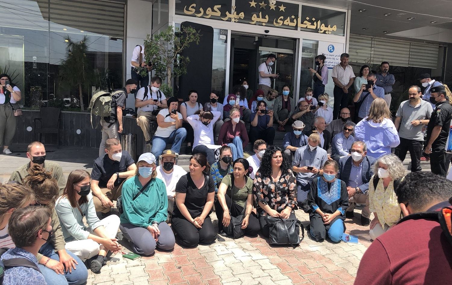 Members of a delegation from Europe visiting the Kurdistan Region to promote peace between the PKK and Turkey sit in front of an Erbil hotel on June 14, 2021. Photo: Defend Kurdistan/Twitter