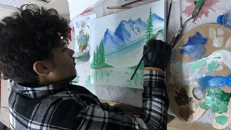 “Life here was bad, our situation was bad [when we arrived]. It is still bad, but now it’s a bit better,” he said, adding strokes of white to his landscape canvas of a lakeside scene.