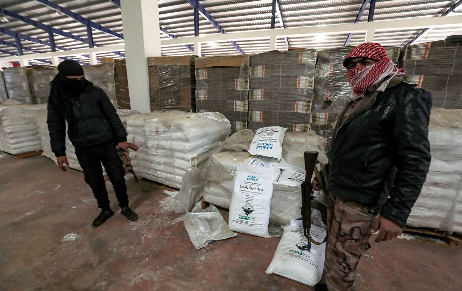 Syrian rebel fighters inspect sacks marked to contain flakes of caustic soda at a drug manufacturing facility in the city of Douma in the Eastern Ghouta region on the eastern outskirts of Damascus on December 12, 2024. Photo: Bakr al-Kasem/AFP