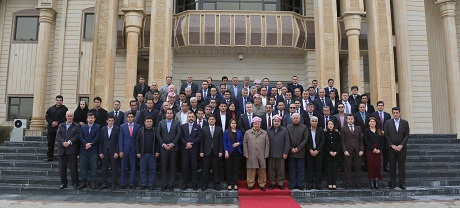 Masoud Barzani and presidential staff pose for a photo in Erbil, Kurdistan Region, on March 16, 2019, in remembrance of the Halabja genocide. Photo: Masoud Barzani office