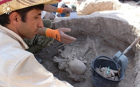 DUHOK, Kurdistan Region – Against the fine yellow dust coating the landscape, the brilliant white of a human skeleton juts conspicuously from the earth.