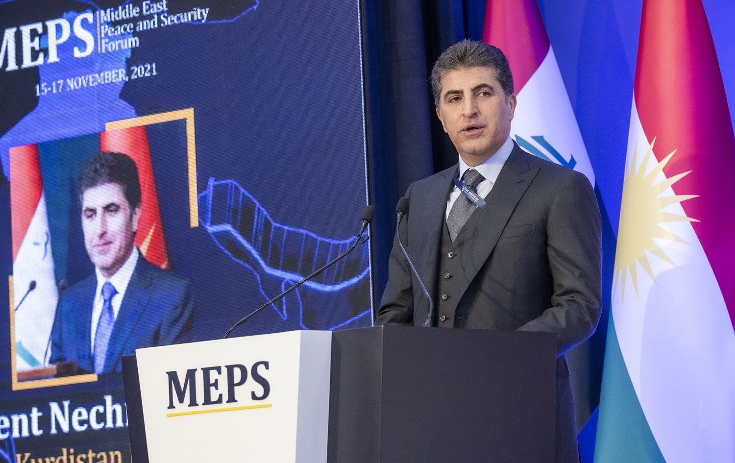 Kurdistan Region President Nechirvan Barzani: In the Middle East, achieving and preserving peace and stability is a very big challenge and a common responsibility for all the nations in the region.#meps21 pic.twitter.com/K9cREY9ZRk