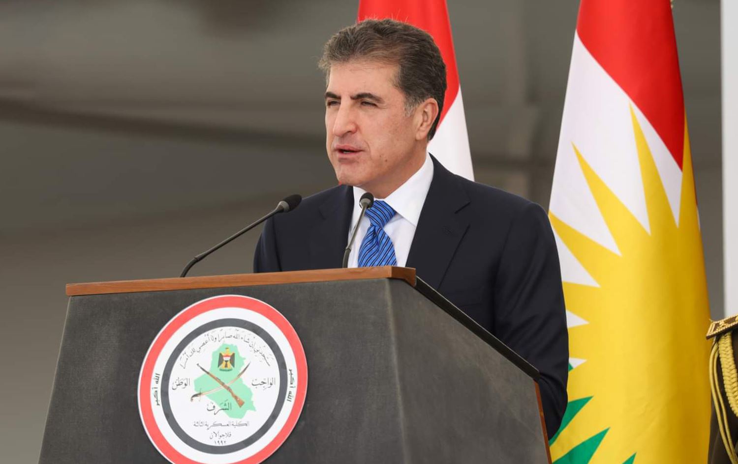 Kurdistan Region President Nechirvan Barzani speaking at the Qalachwalan Military Academy graduation in Sulaimani on November 16, 2024. Photo: Rudaw