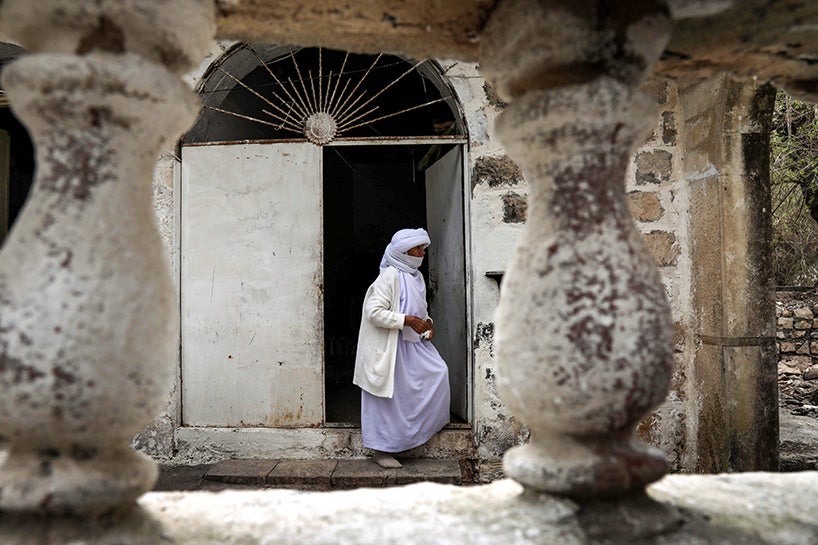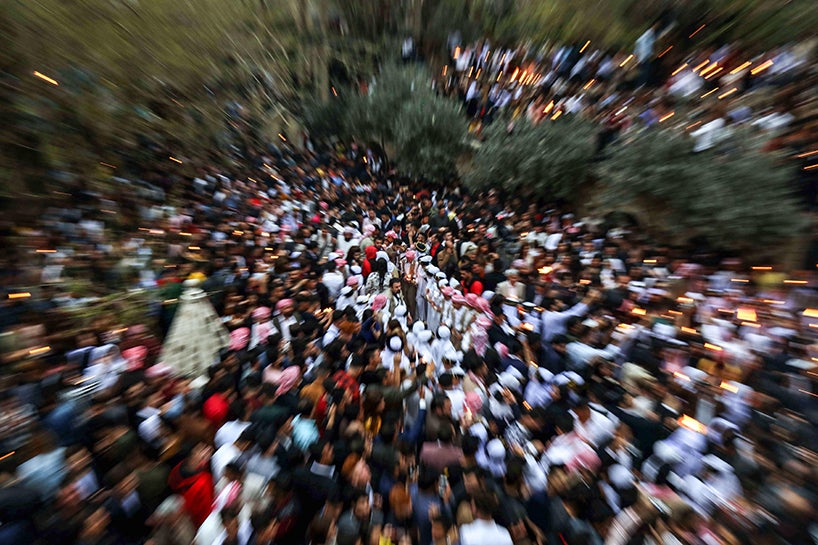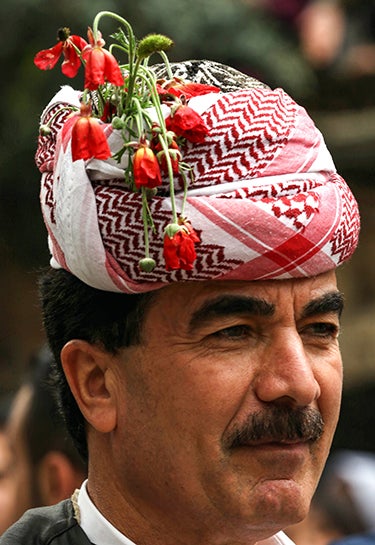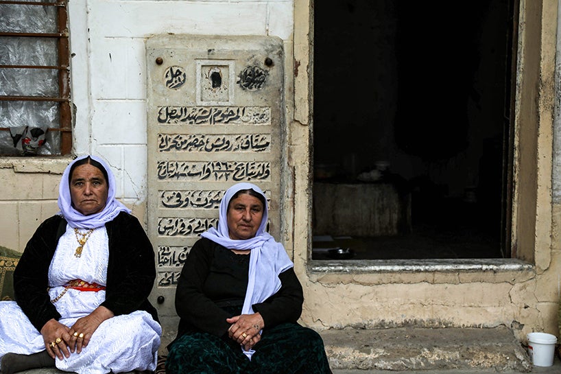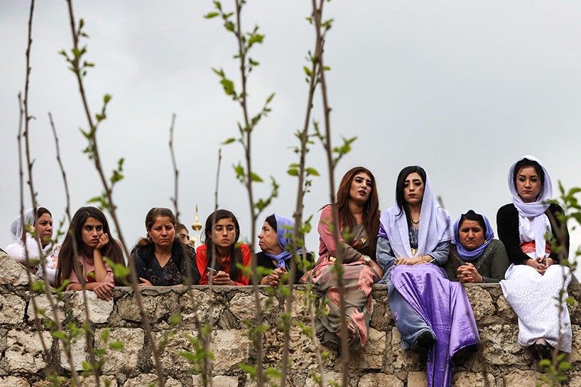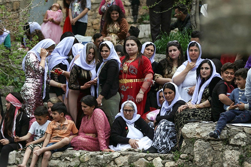 Men, women, and children of the ethno-religious Yezidi minority group gather at their holy Temple of Lalish in Duhok province, Kurdistan Region, on Tuesday evening.