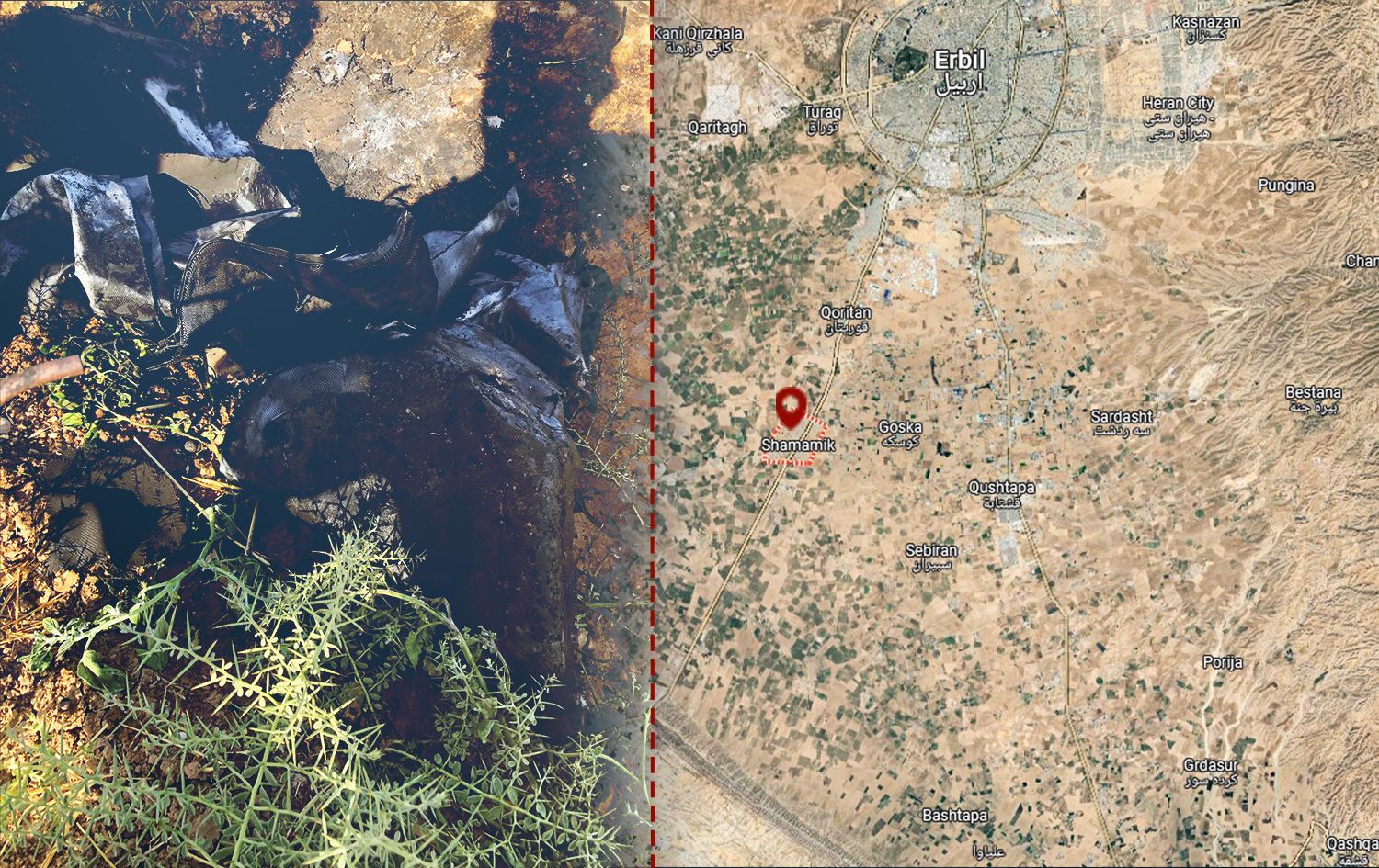 Remains of drones that fell in southeast Erbil (left) and map showing the location where the remains fell (right). Graphic: Rudaw