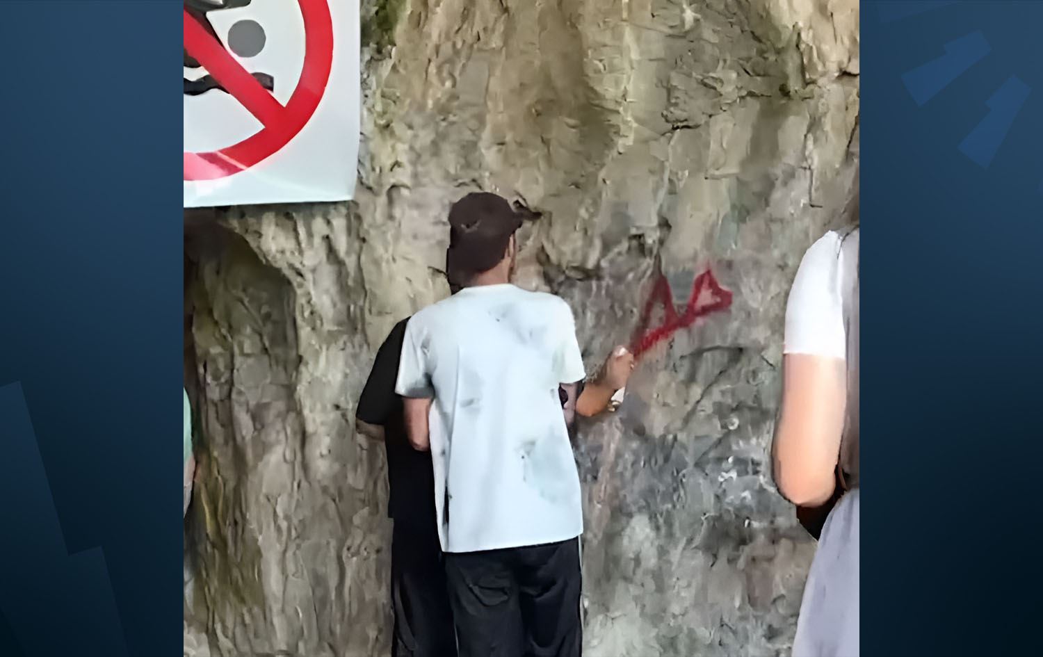 A tourist defaces Bahiri Cave in Zakho’s Independent Administration, Kurdistan Region, on August 17, 2025. Photo: Screengrab/Submitted