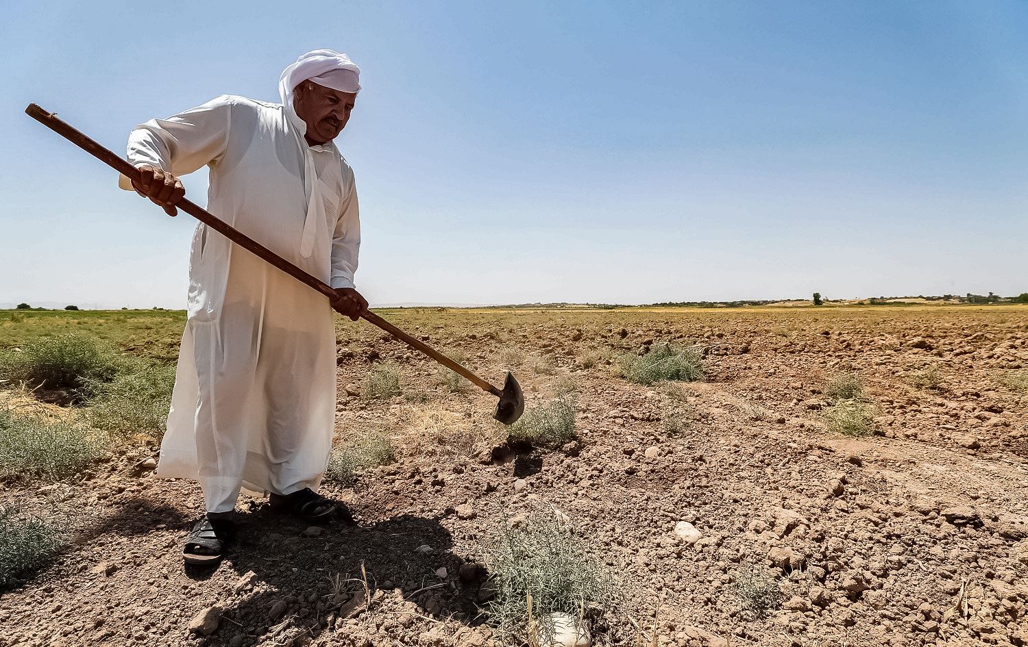 A farmer digs with a shovel in a field on his farm in the Khanaqin area on June 24, 2021. Photo: Ahmed al-Rubaye/AFP