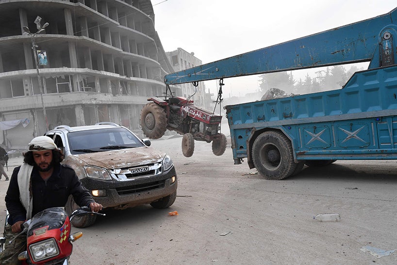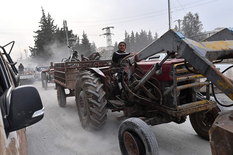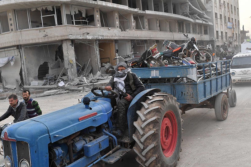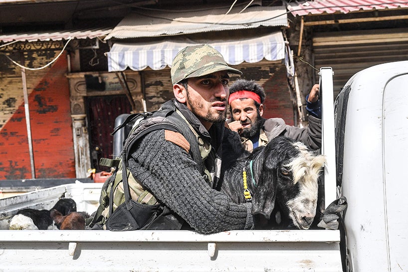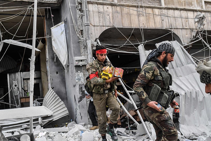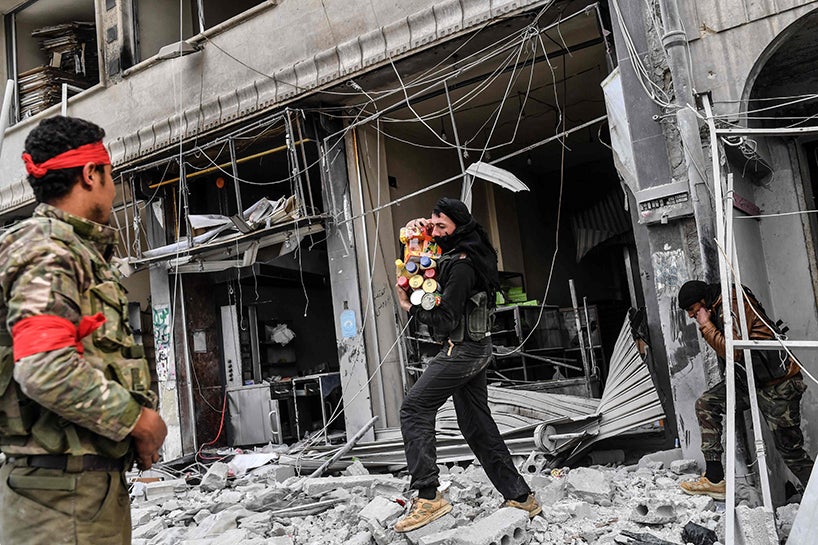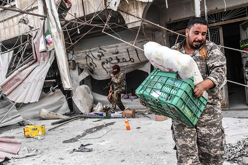 The fighters were photographed by AFP breaking into shops, restaurants and homes and seen making off with food, livestock, tractors, electronic equipment, blankets and other goods in trucks and trailers.