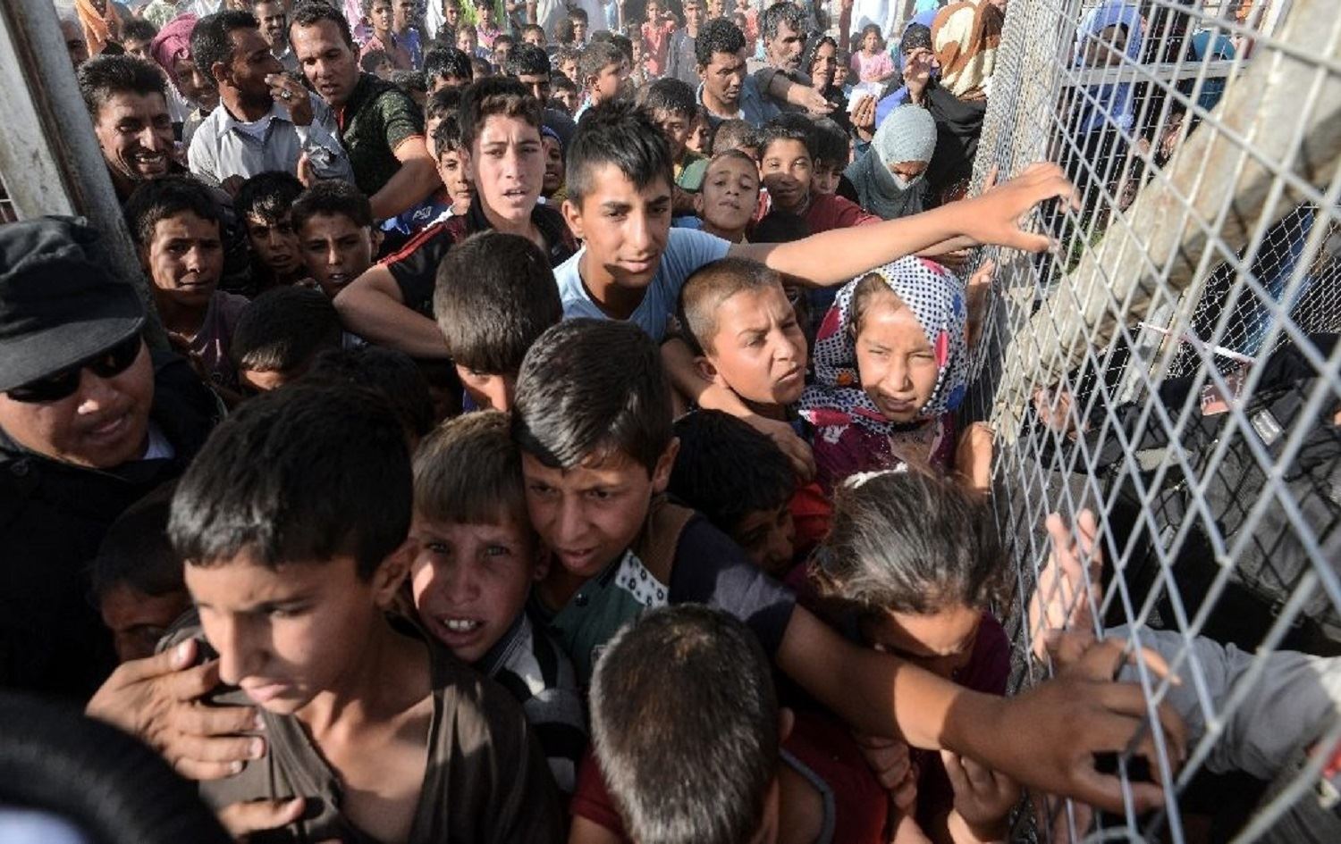 Displaced Iraqis queue behind a fence at the Hasansham IDP camp, 30 kilometres east of Mosul on June 10, 2017. Photo: Mohamed el-Shahed/AFP