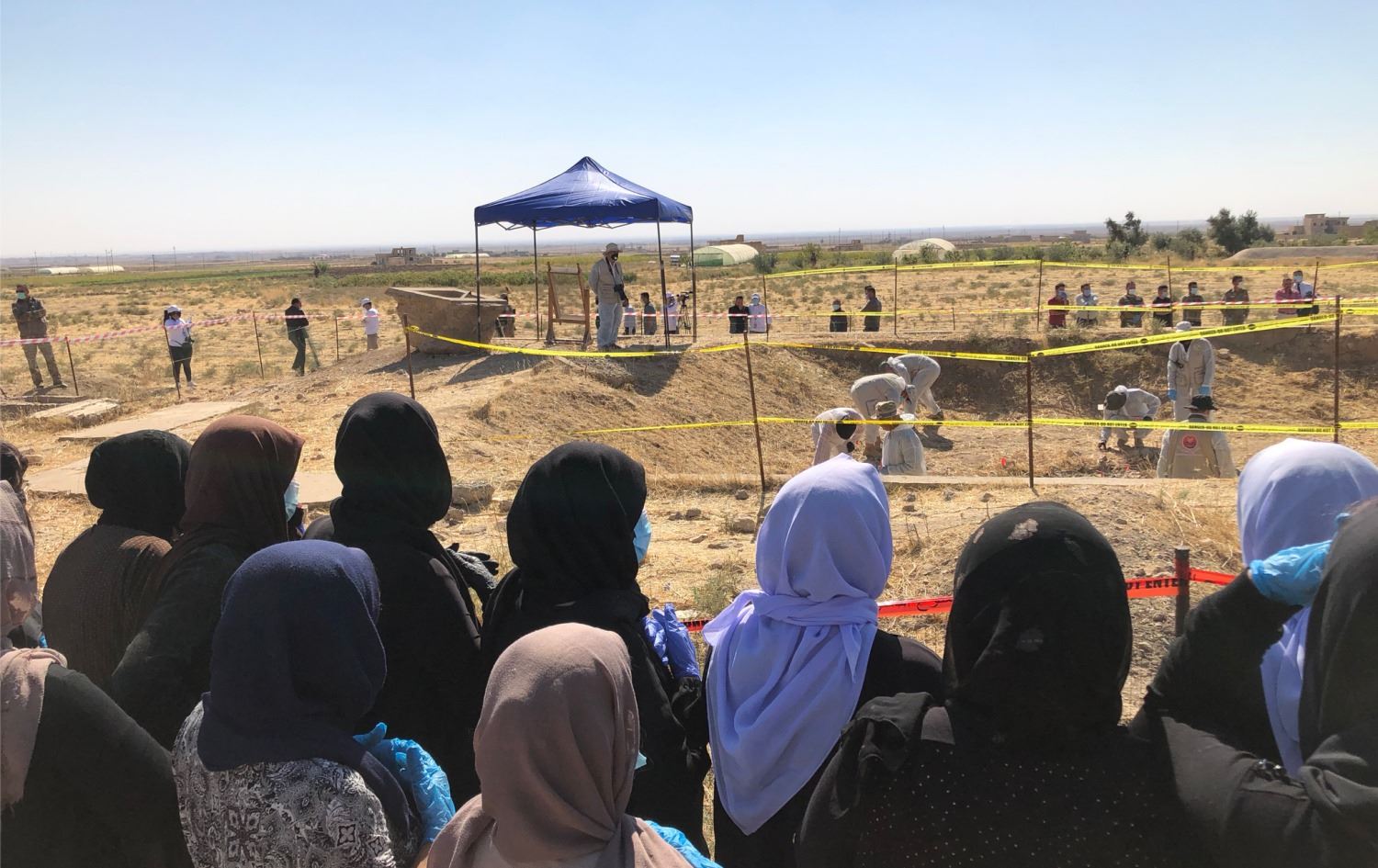 Yazidi women watch as a mass grave is exhumed in Solagh village in Shingal on October 24, 2020. Photo: Fazel Hawramy/Rudaw