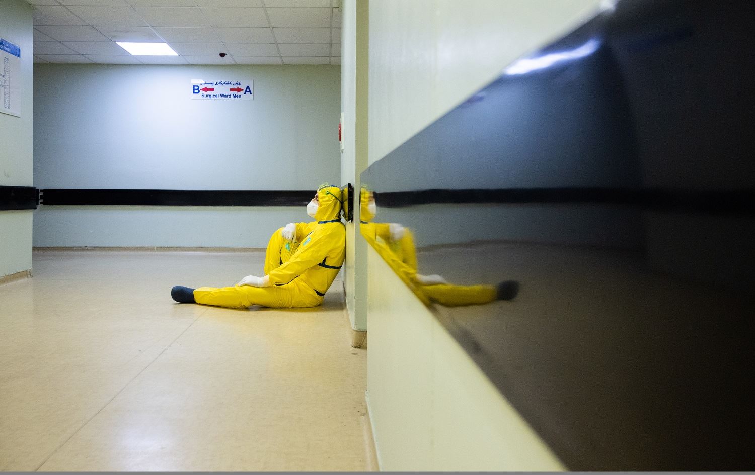 A health worker rests at Rizgary Hospital in Erbil on June 8, 2020. Photo: Bilind T. Abdullah / Rudaw