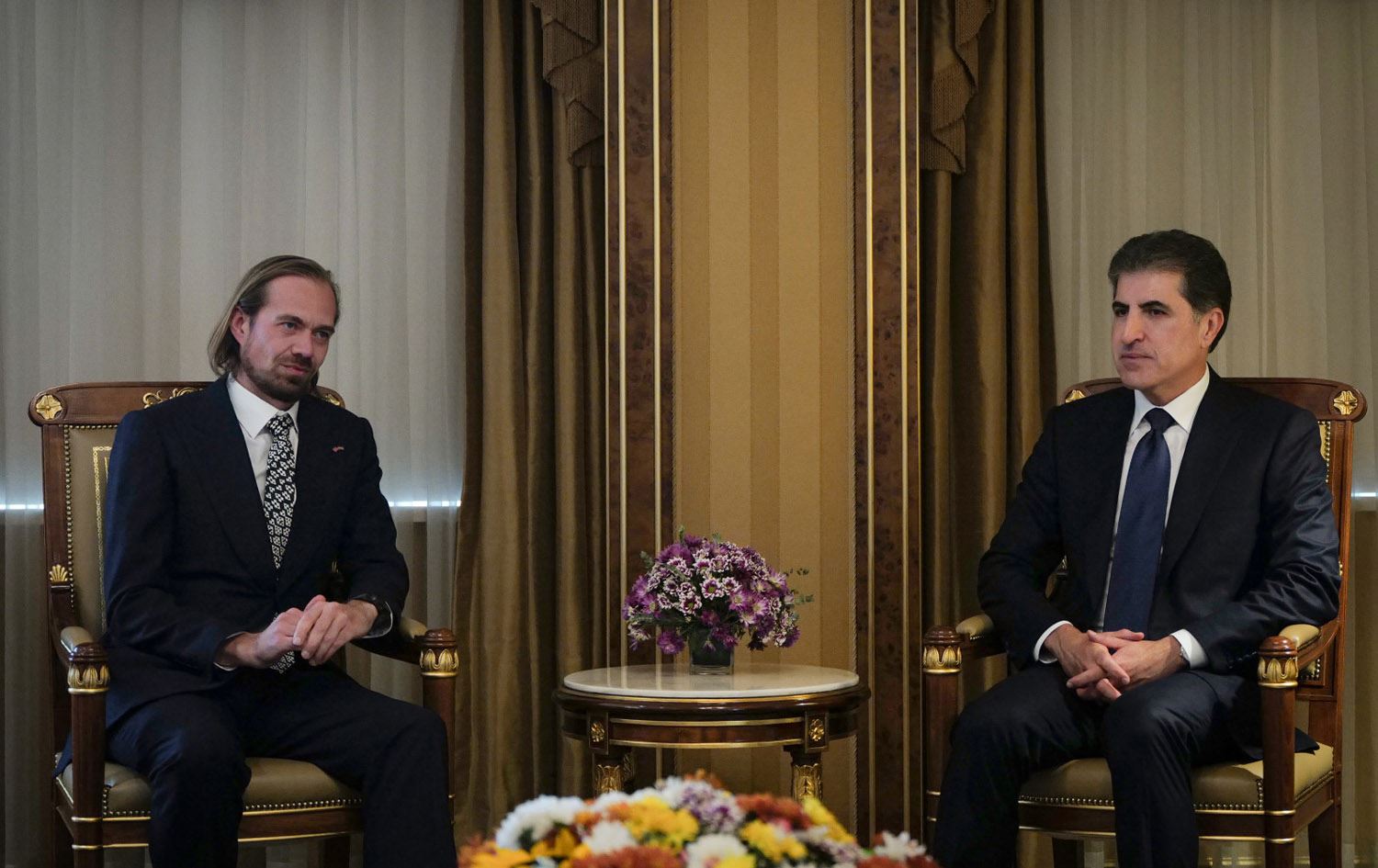Kurdistan Region President Nechirvan Barzani (right) receiving UK Consul to Erbil Andrew Bizley on August 20, 2024. Photo: Kurdistan Region Presidency