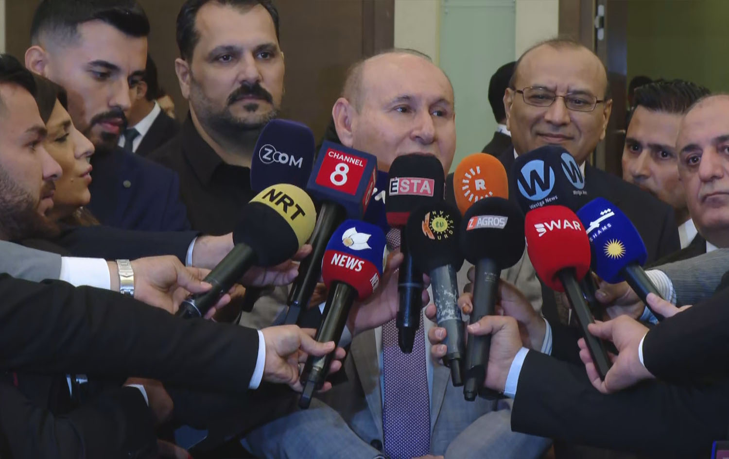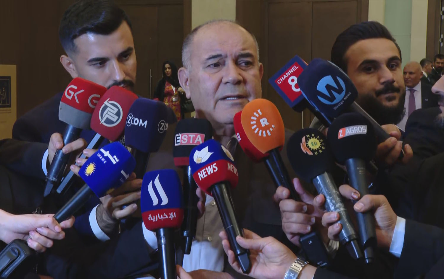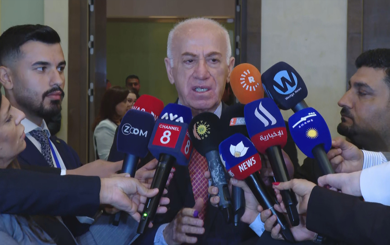 Shalaw Kosrat Rasul, the head of the Patriotic Union of Kurdistan (PUK) list in Erbil speaking to journalists in Erbil on October 20, 2024. Photo: Rudaw