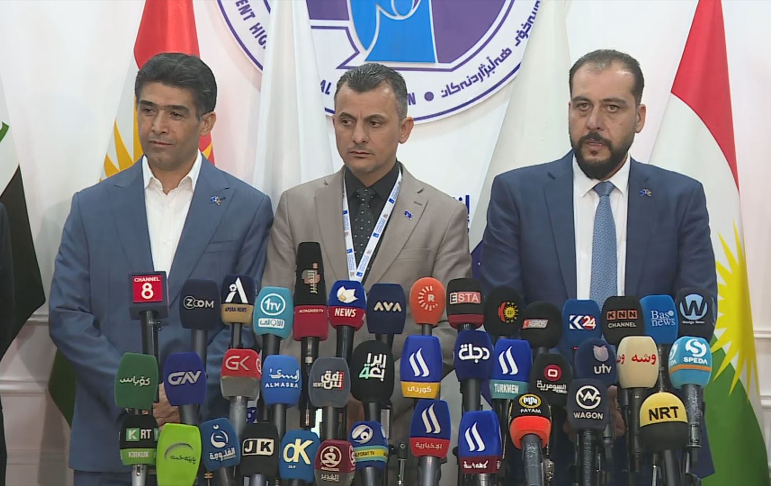 Aisar Yassin, a spokesperson for the Iraqi Independent High Electoral Commission (IHEC) [center], speaking during a press conference in Erbil on October 20, 2024. Photo: Rudaw/screengrab