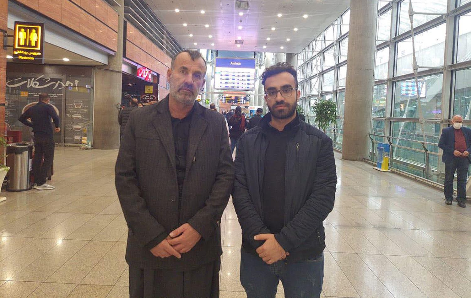 Sirwan Alipour's father Abubakir Alipour (left) and his brother Saman Alipour (right) at Tehran's Imam Khomeini Airport awaiting the arrival of Sirwan's body from France on December 20, 2021. Photo: Submitted