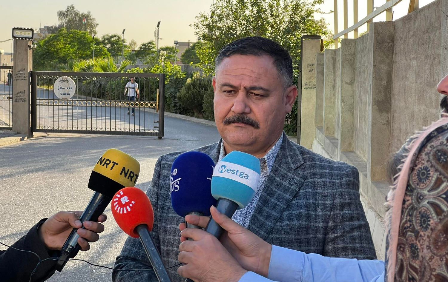 Erbil police spokesperson Hogir Aziz speaking to reporters in front of the city's forensic department on April 21, 2022. Photo: Dilan Sirwan/Rudaw