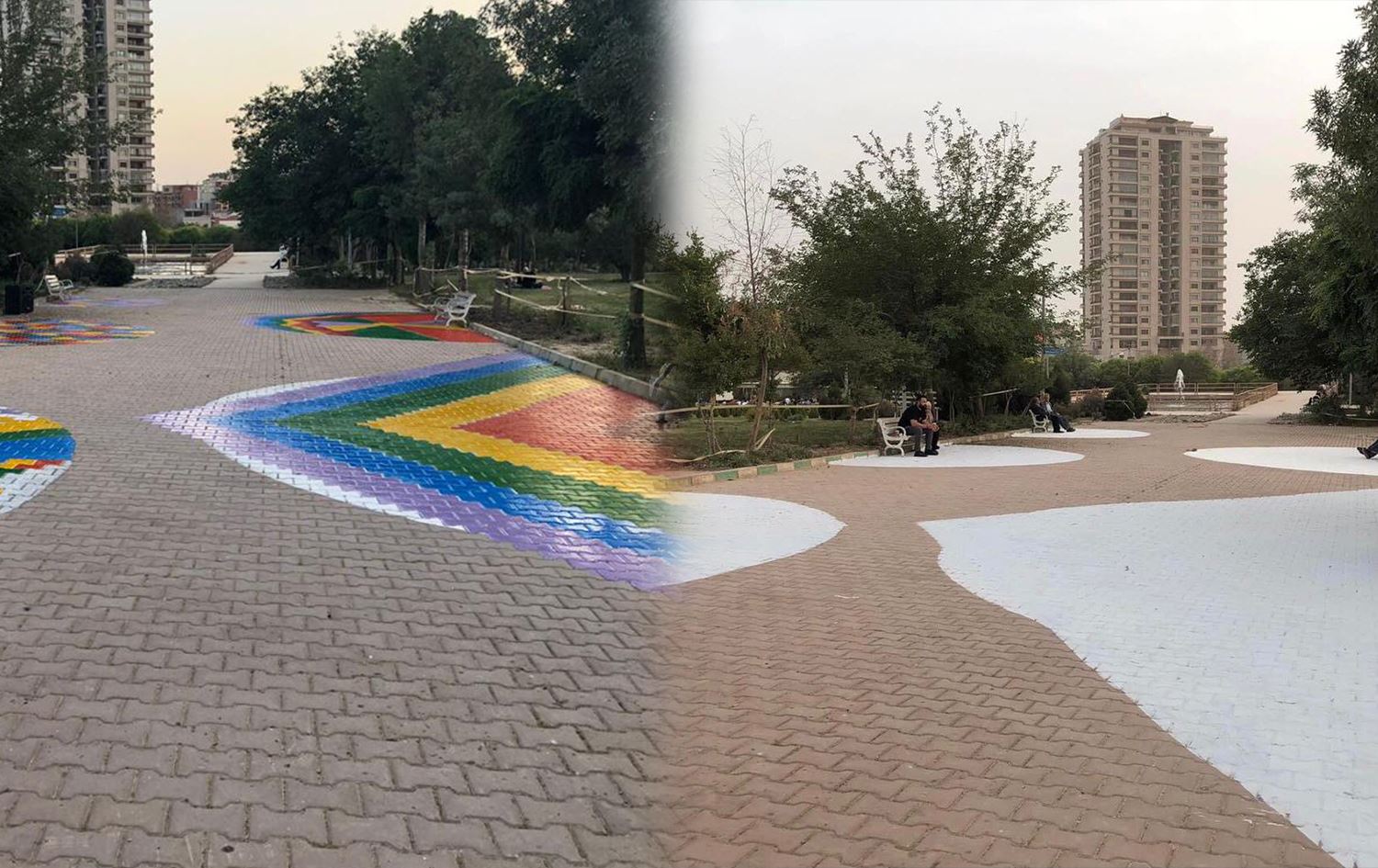 Photos show rainbow murals in Sulaimani's Azadi Park on May 19th (left) and covered by white paint on May 20 (right). Photos: submitted