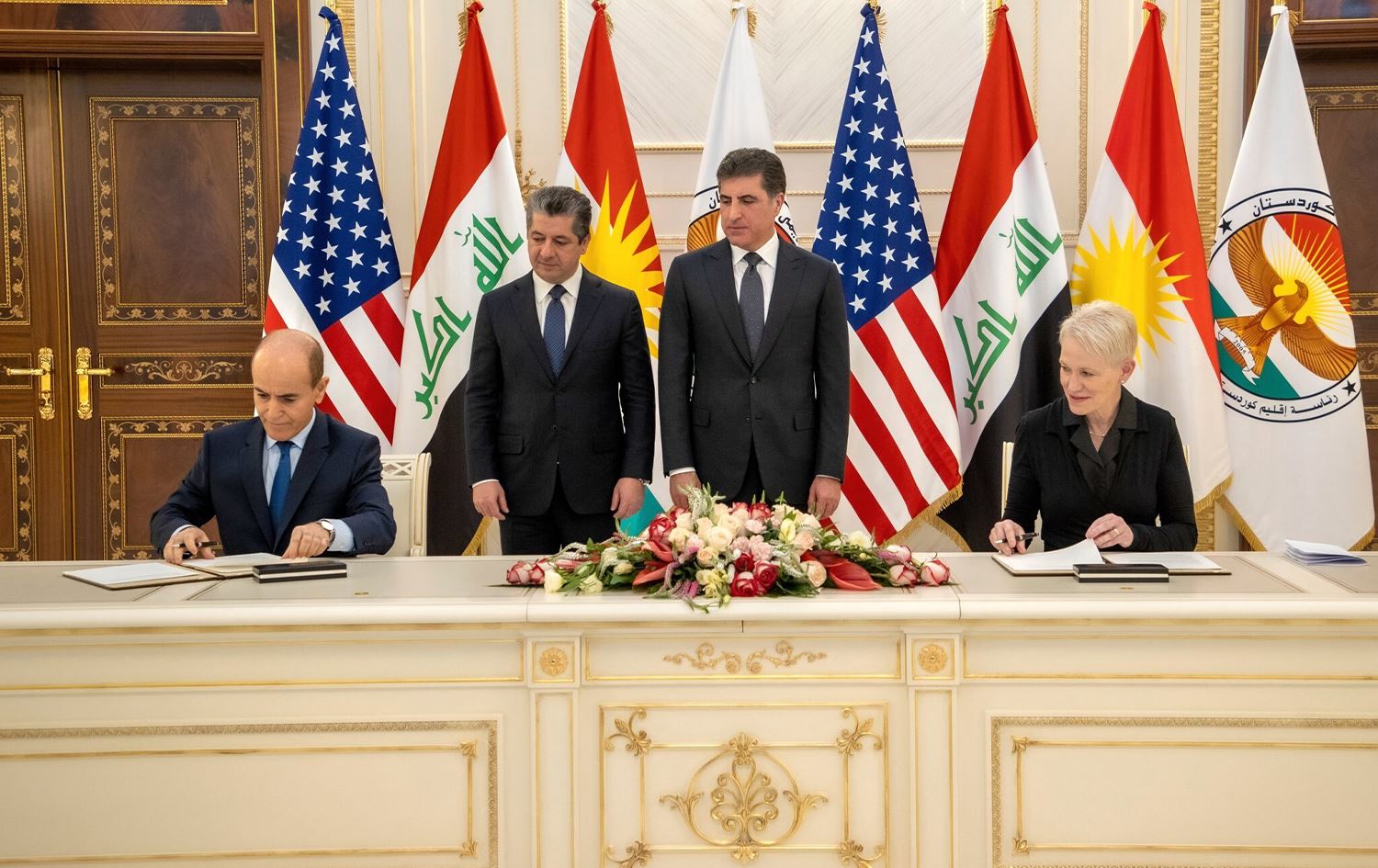 Kurdistan Region President Nechirvan Barzani, Prime Minister Masrour Barzani oversee the signing of the renewal of the memorandum with a US delegation led by Assistant Secretary of Defense for International Security Affairs Celeste Wallander on September 21, 2022. Photo: President Barzani's office