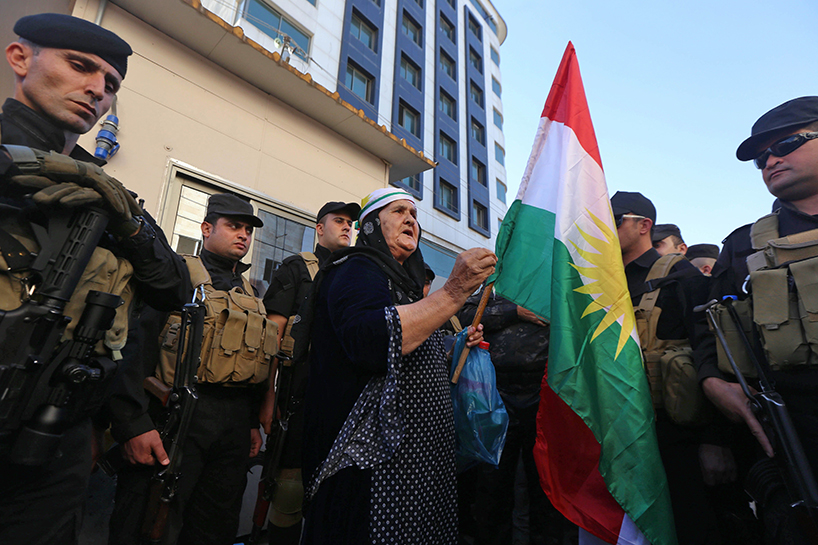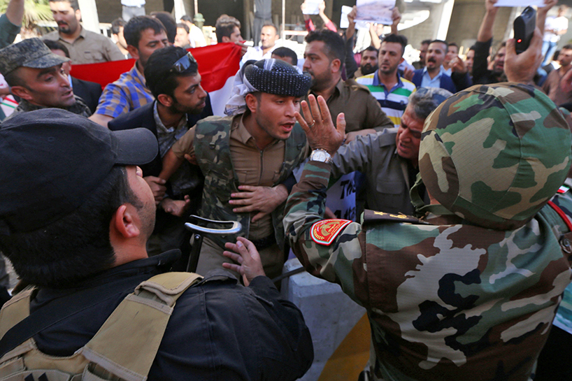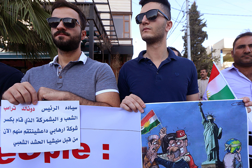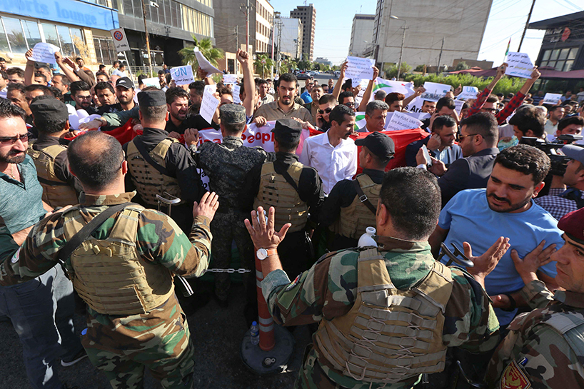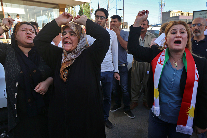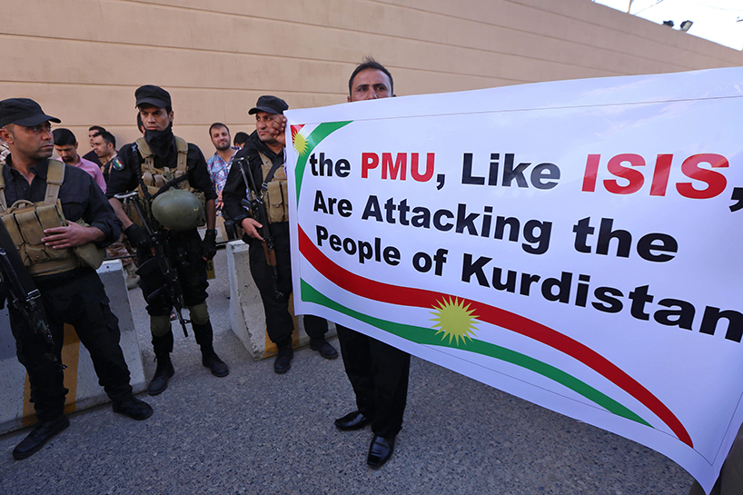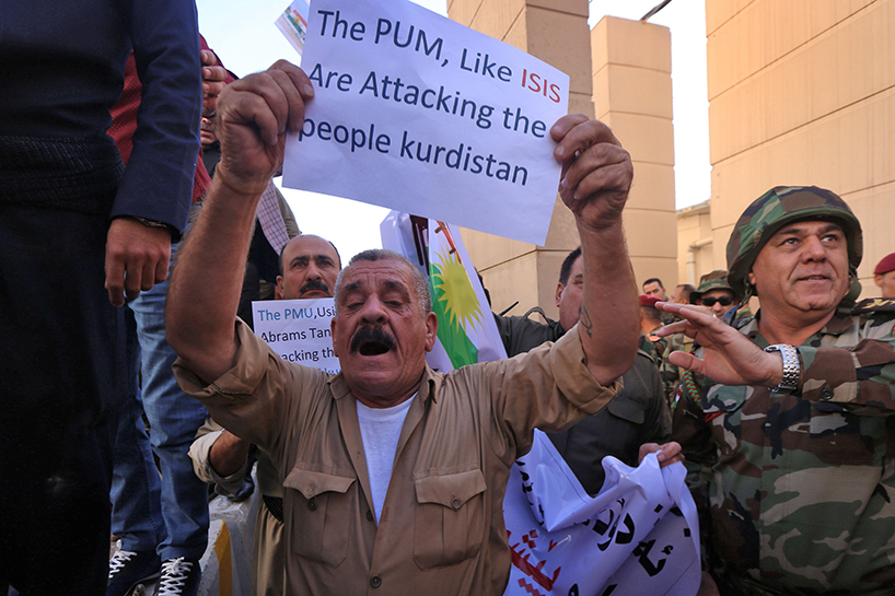 The protest took place as the Iraqi forces, backed by the mainly Shiite Hashd al-Shaabi, were about 50 km south of Erbil, the capital of the Kurdistan Region.