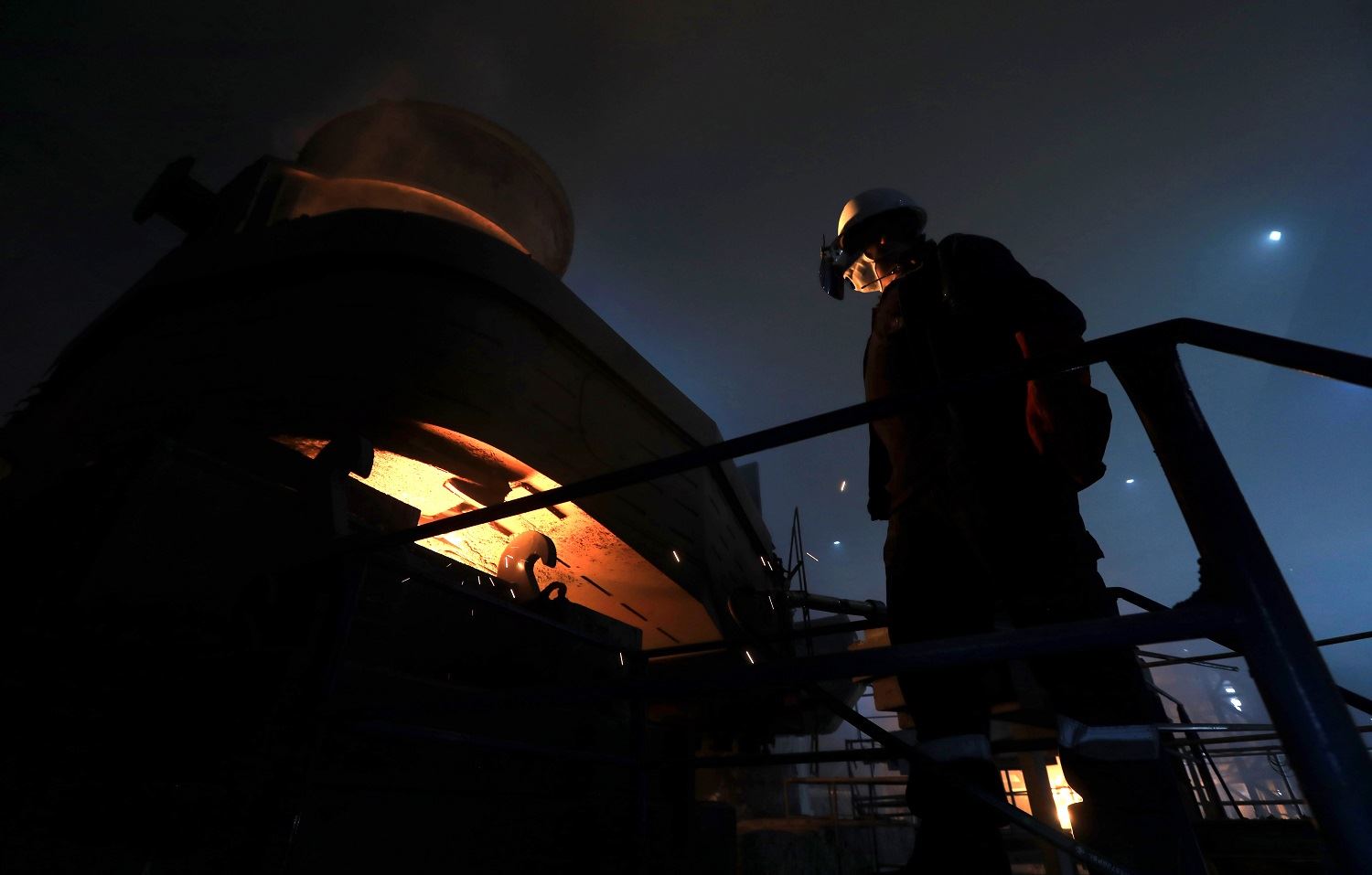 A worker operates a furnace for steelmaking at Hend steel company in Erbil, the capital of the northern Iraqi Kurdish autonomous region, on October 1, 2020. Photos: Safin Hamed / AFP