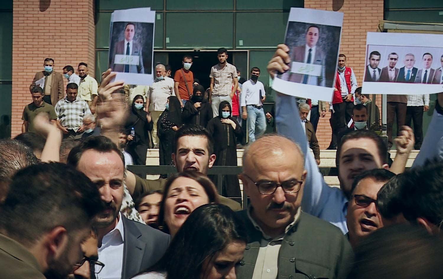 Families, activists, and MPs gathered outside an Erbil courthouse where the trial of the five Duhok detainees was on September 8, 2021. Photo: Rudaw/screenshot