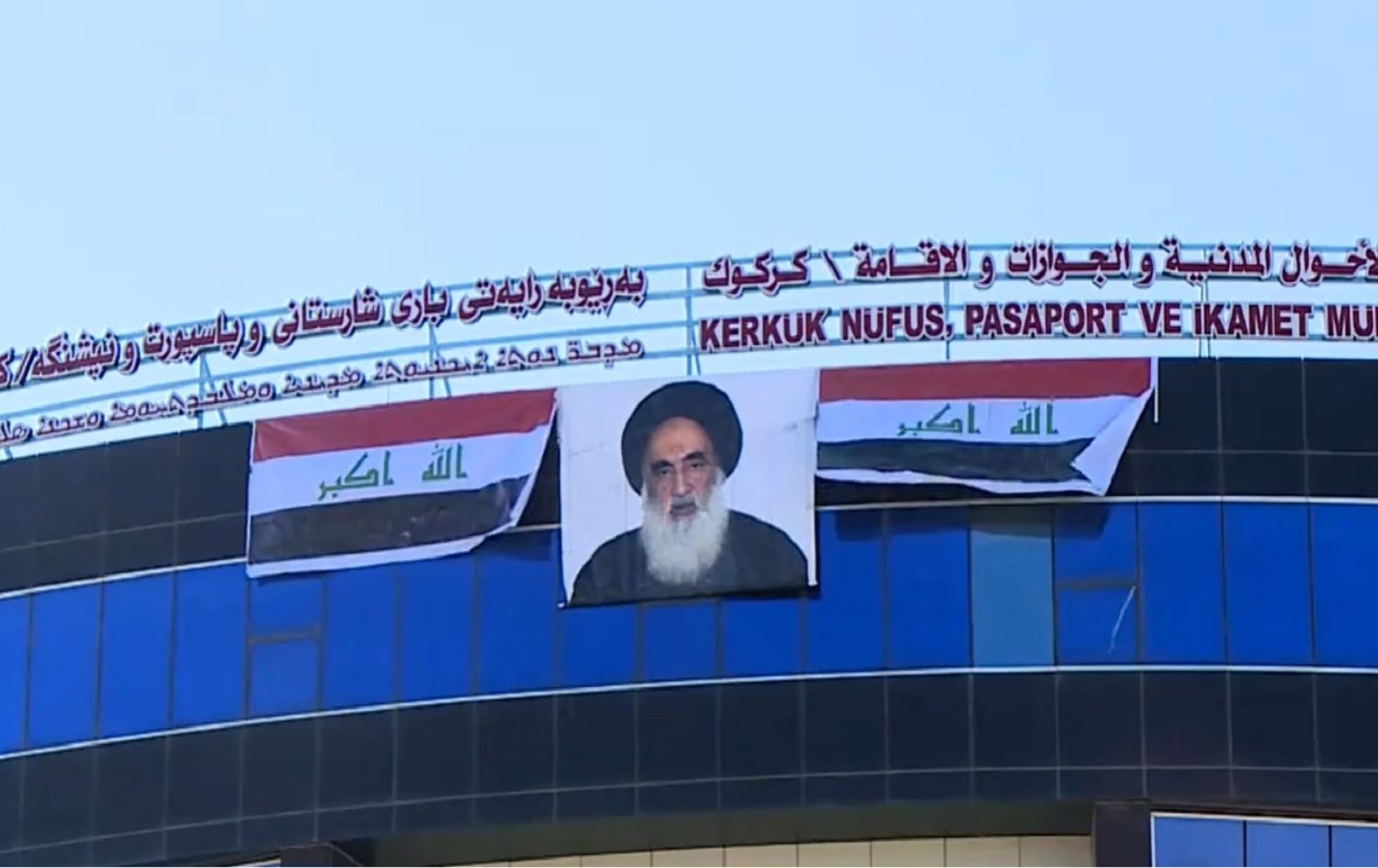 A banner featuring the face of Ayatollah Ali al-Sistani, the highest Shiite religious authority of Iraq, hangs between two Iraqi national flags from a government building in Kirkuk, November 2019. Photo: Rudaw TV