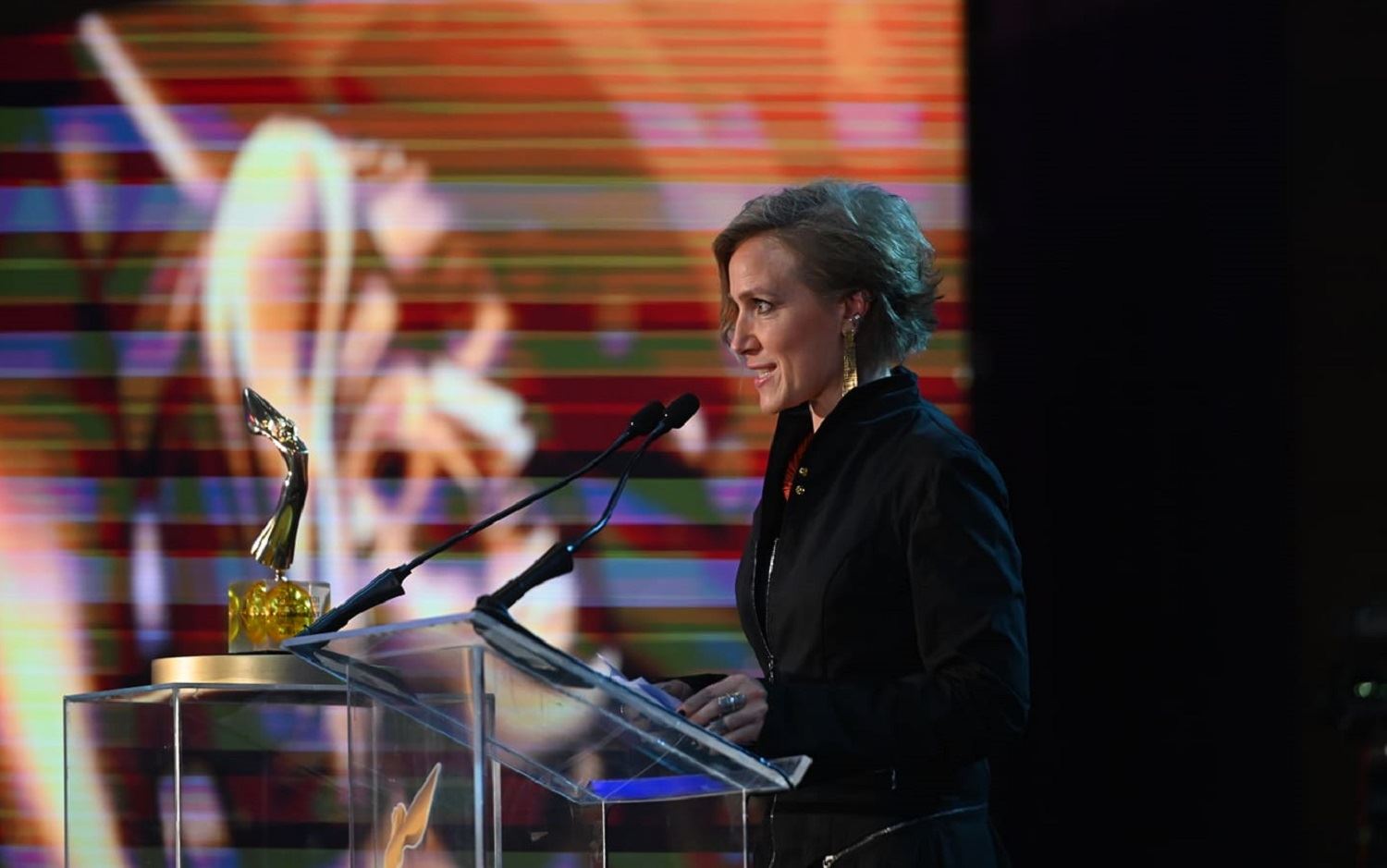 Shifa Gardi International Award winner Arwa Damon speaks at the award's ceremony in Erbil on February 22. 2020. Photo: Bilind T. Abdullah / Rudaw