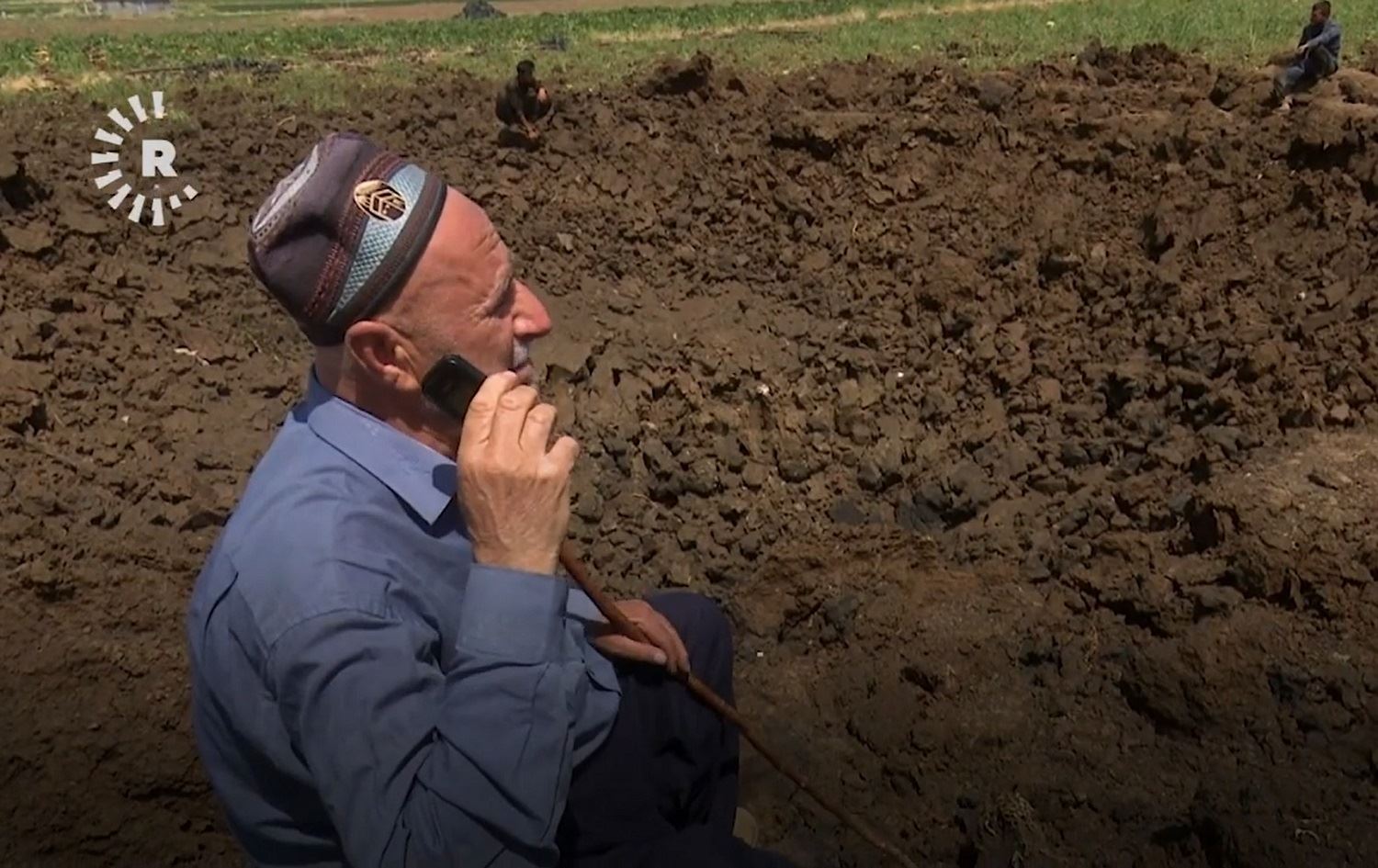 Farmer Karim Marif sits on the edge of a crater in his field, created by a Turkish bomb, in August 2021. Photo: Rudaw