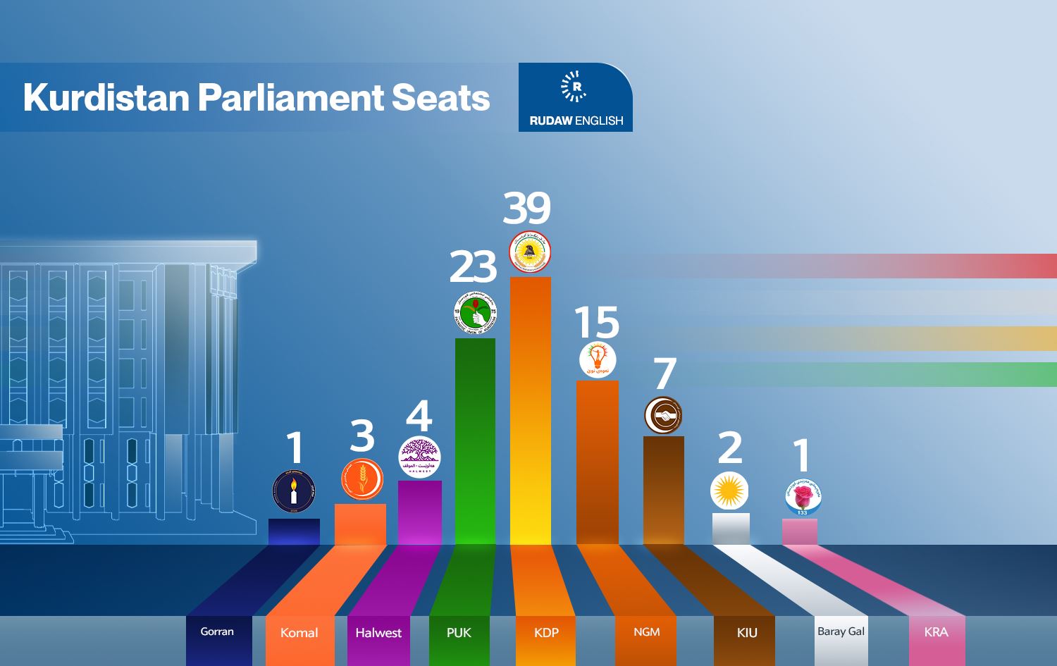 Out of the 100 seats in the upcoming parliament, the ruling Kurdistan Democratic Party (KDP) is expected to secure 39, the highest number of seats, followed by the Patriotic Union of Kurdistan (PUK), with 23 seats.