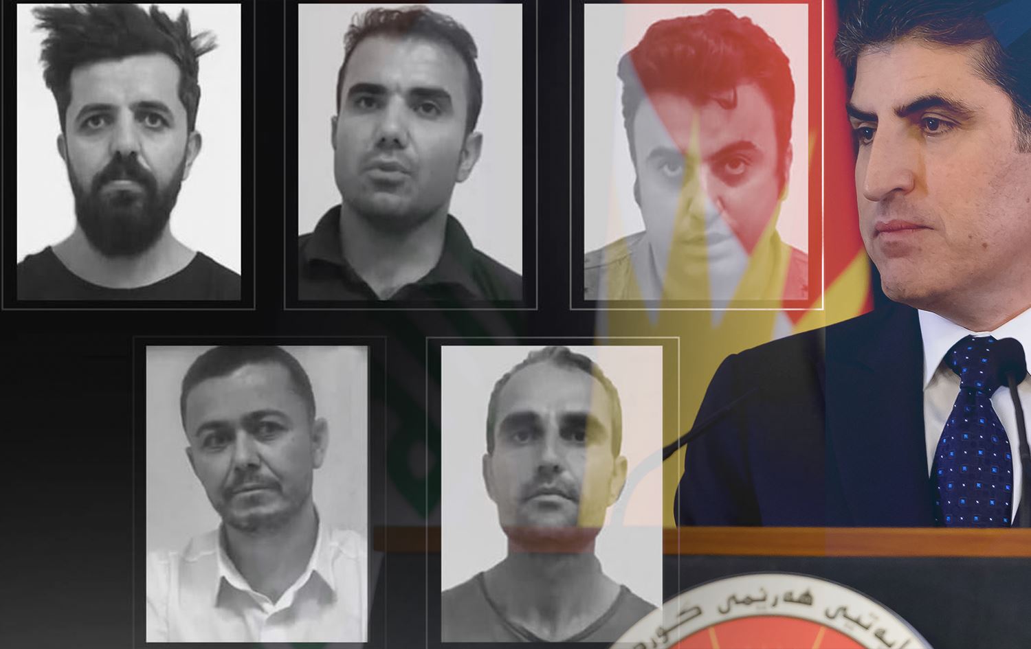 From left: Hariwan Issa, Guhdar Zebari, Sherwan Sherwani, Shvan Saeed, and Ayaz Karam. Photos: handout/KRSC; Kurdistan Region President Nechirvan Barzani (right). Photo: Rudaw; Graphic: Rudaw