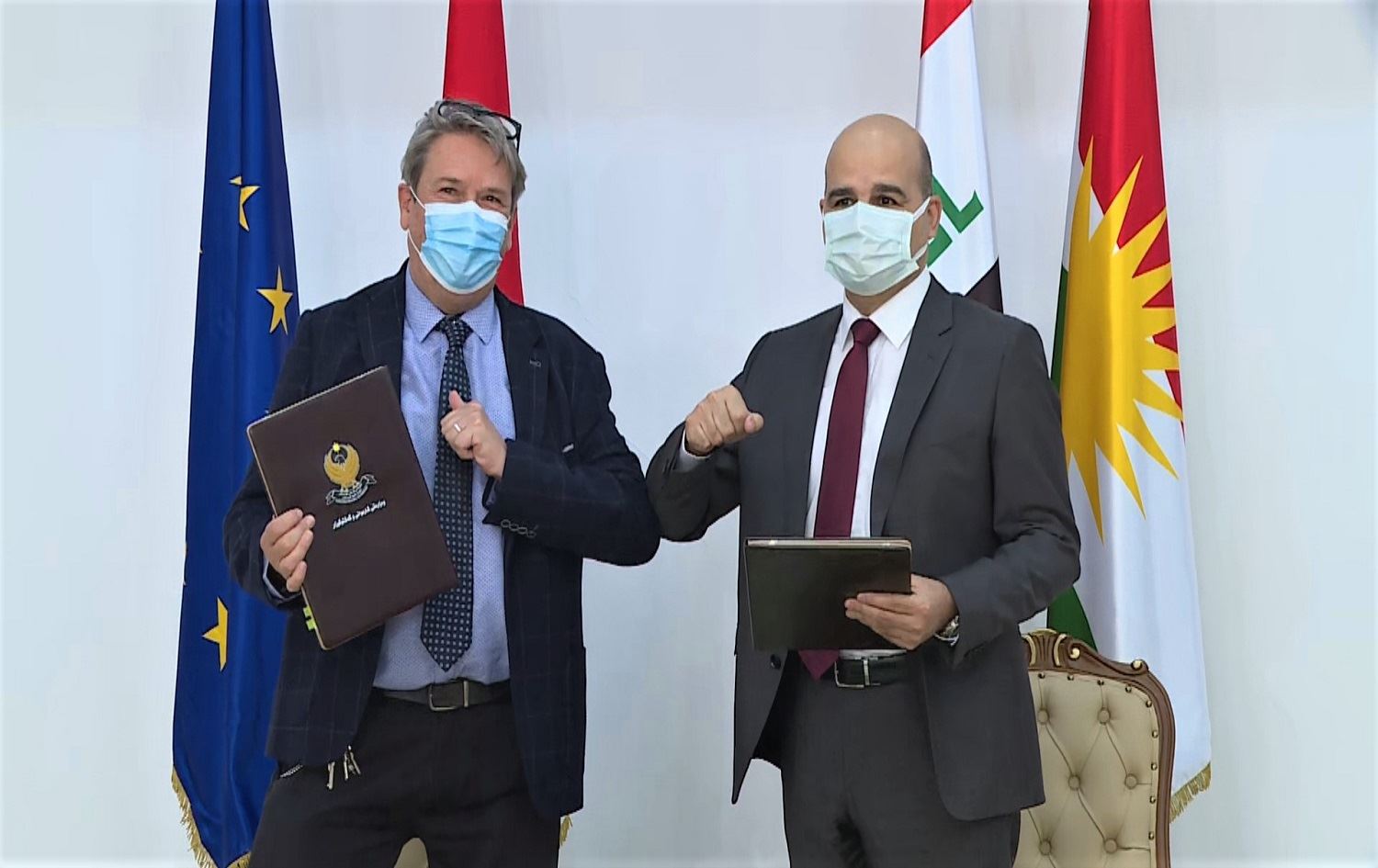 Association of Netherlands Municipalities team leader in the Kurdistan Region Michel Ligthart [left] signed an MoU with Sasan Awni, Minister of Municipality and Tourism [right] on May 23, 2021. Photo: screenshot/Rudaw